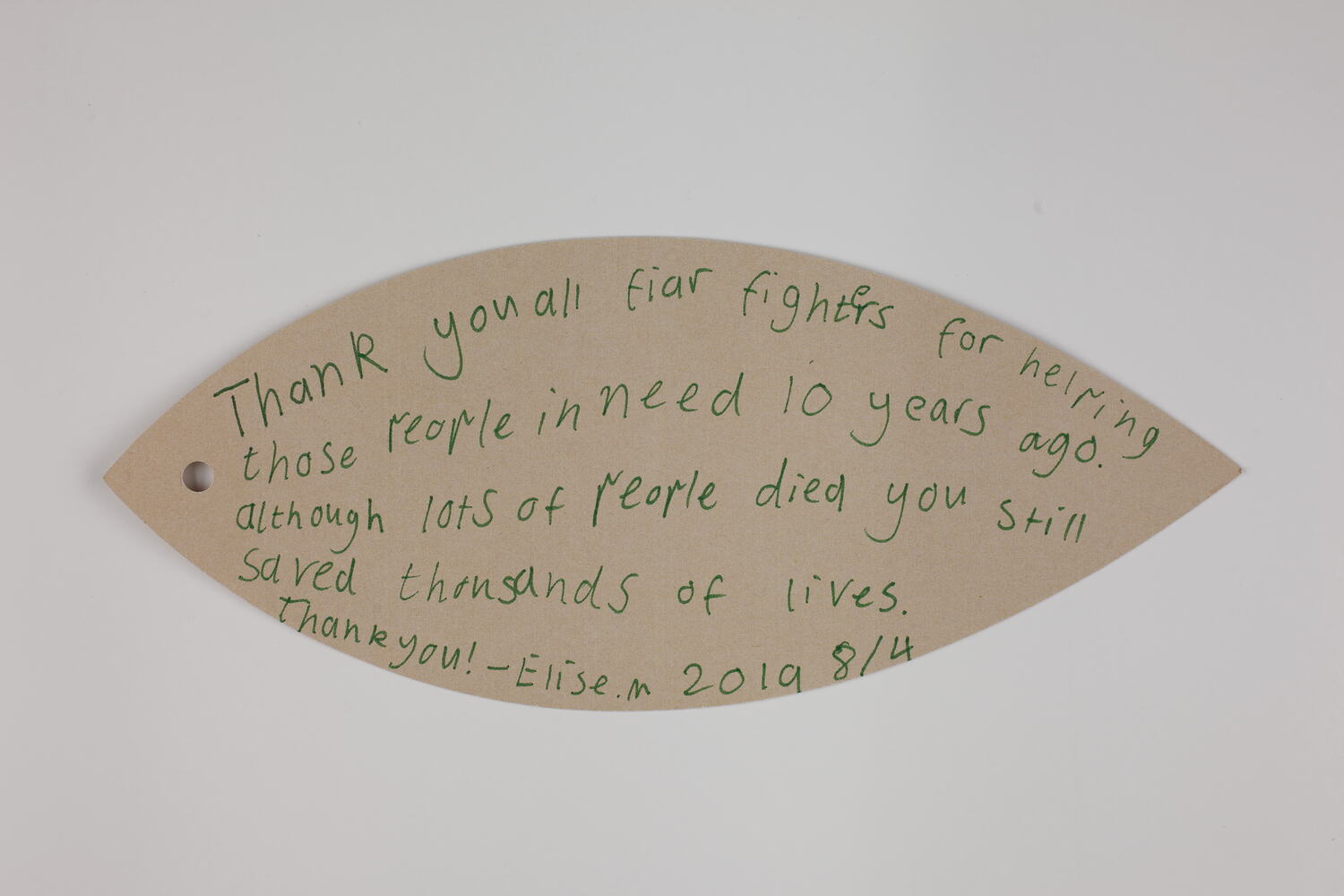Thank you all fiar [sic] fighters for helping / those people in need 10 years ago. / although lots of people died you still / saved thousands of lives. / Thankyou! - Elise. M 2019 8/4