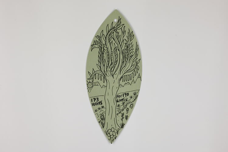 One of twenty paper leaves with hand-written messages selected from the thousands submitted by visitors during the 2019 'From the Heart' exhibition at the Melbourne Museum. Blank paper leaves were available for visitors to the exhibition to write and attach messages to a symbolic Tree of Remembrance.