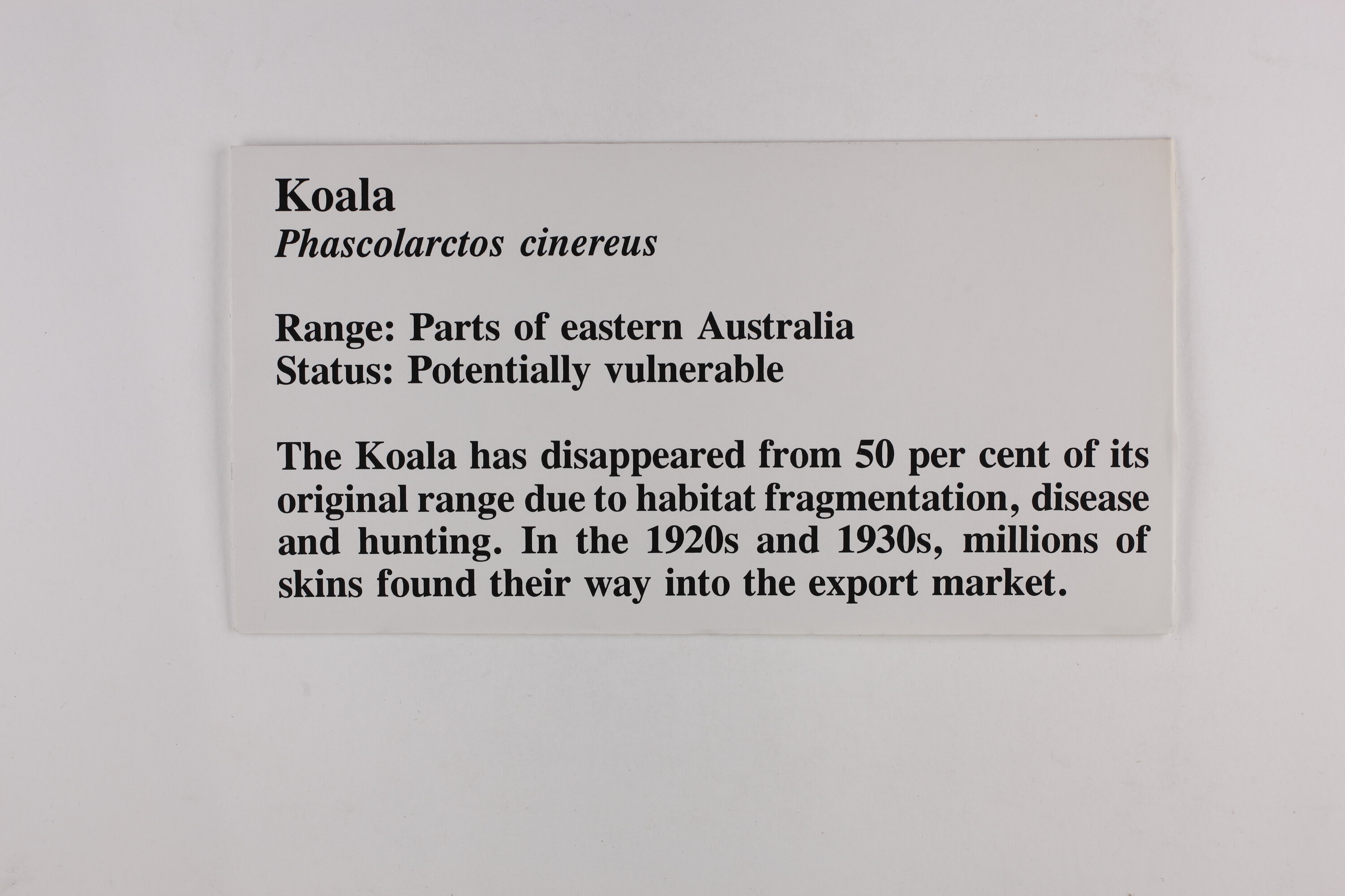Koala / Phascolarctos cinereus / Range: Parts of eastern Australia / Status: Ptentially vulnerable /The Koala has disappeared from 50 per cent of its / original range due to habitat fragmentation, disease / and hunting. In the 1920s and 1930s, millions of / skins found their way into the export market.