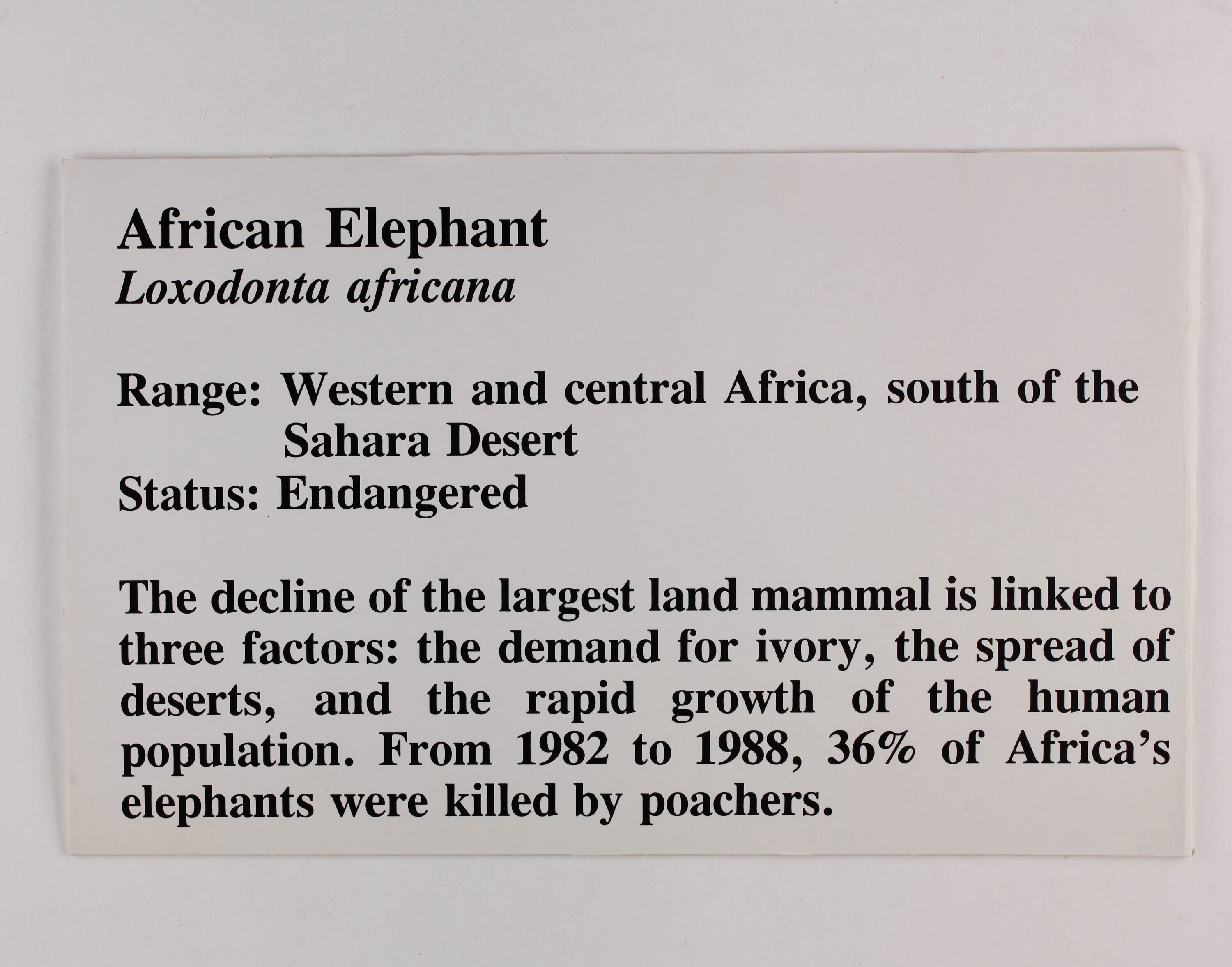 African Elephant /Loxodonta africana / Range: Western and central Africa, south of the Sahara Desert / Status: Endangered / The decline of the largest land mammal is linked to / three factors: the demand for ivory, the spread of / deserts, and the rapid growth of the human population. From 1982 to 1988, 36% of Africa's / elephants were killed by poachers.