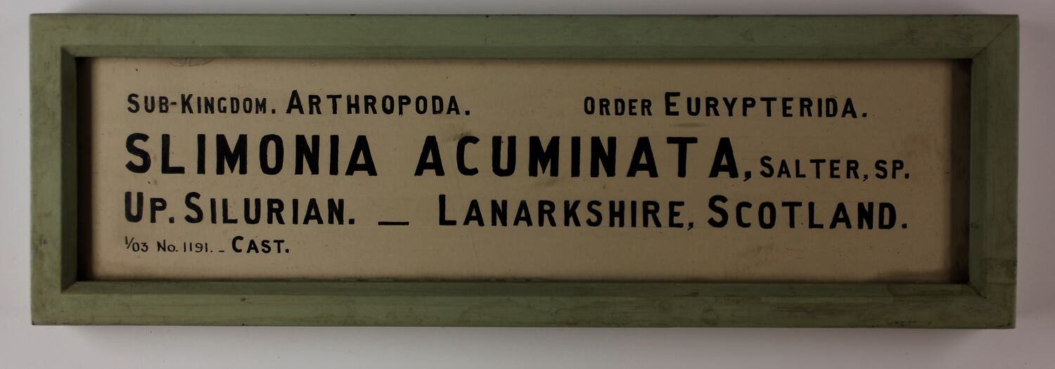 SUB-KINGDON. ANTHROPODA. ORDER EURYPTERIDA. / SLIMONIA SCUMINATA, SALTER, SP. / UP. SILURIAN. - LANARKSHIRE, SCOTLAND. / 1/03 NO. 1191. - CAST.