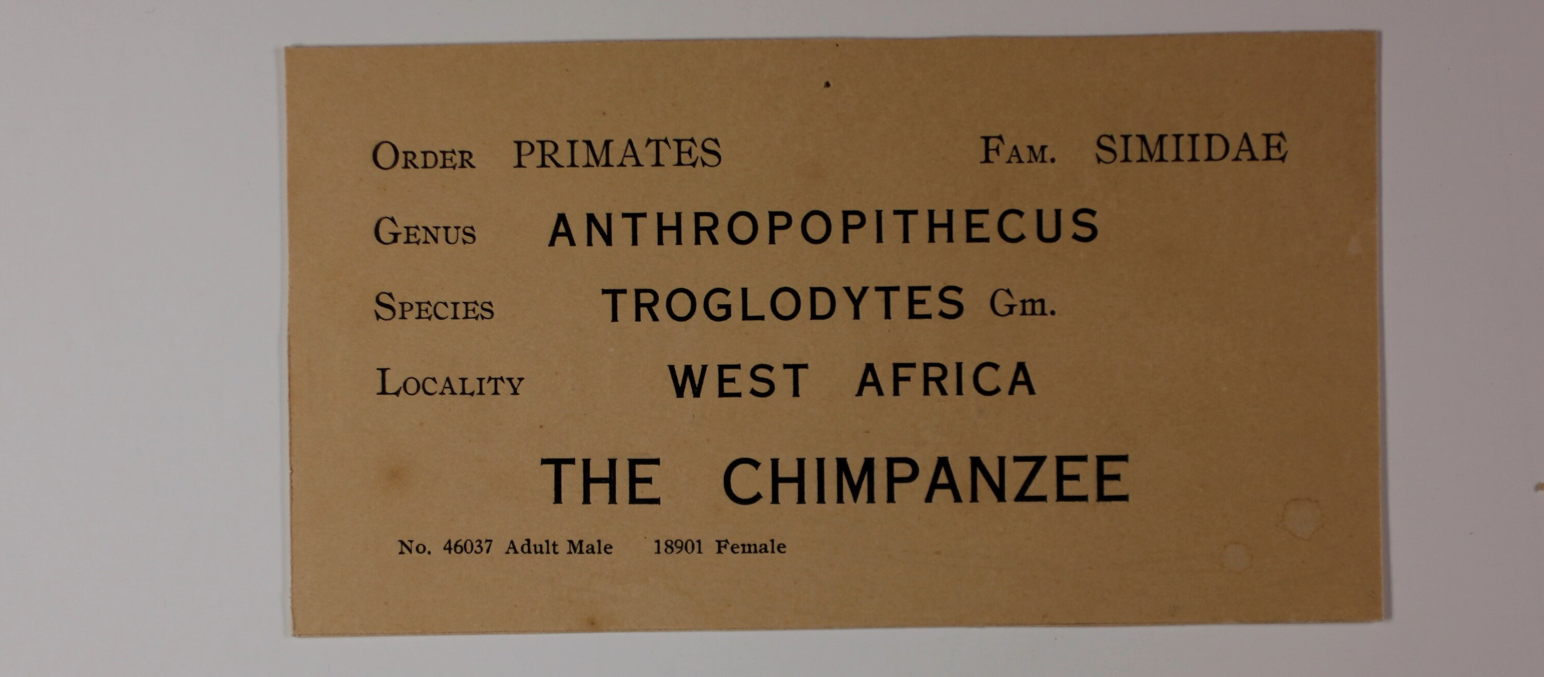 Six printed exhibition labels from 'The Ape' case that were removed from display on May 12, 1998. The specimens had been acquired at different times from the ninteenth century through to the end of the twentieth century and labels appear to have been created when each specimen was added to the display. The resulting group of labels reveals the changing style, materiality and didactic interpretation over time, from the earliest hand-painted labels to professionally printed group / family context labels.
