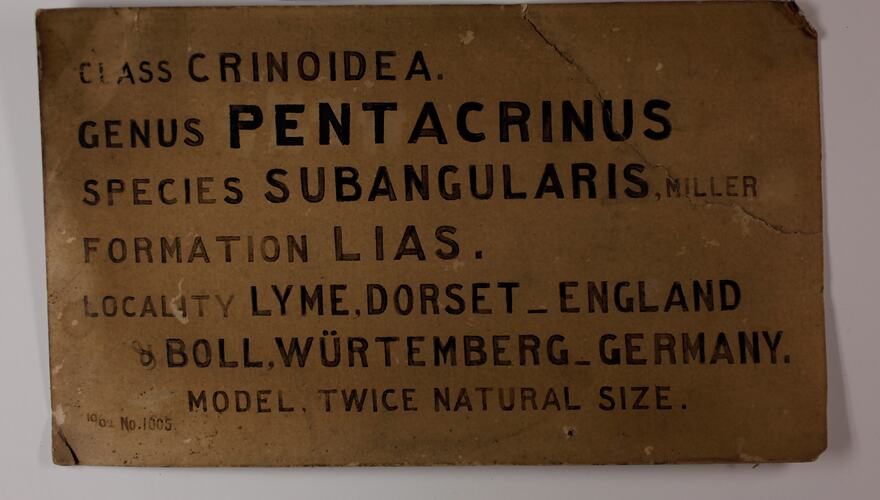 Printed Crinoid (marine invertebrates) exhibition label on textured card made for a model featured in a display at the National Museum of Victoria, after 1902.