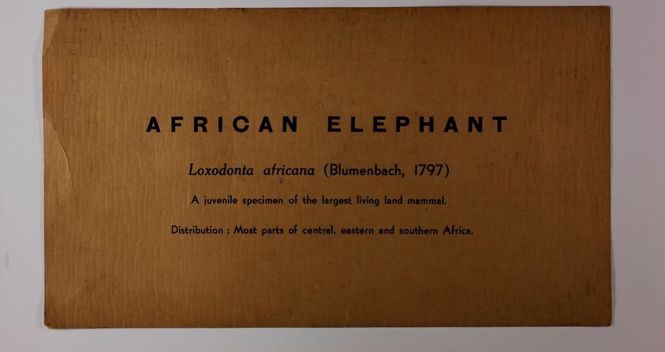 Exhibition label for African Elephant when displayed at the National Museum of Victoria during the 1960s.