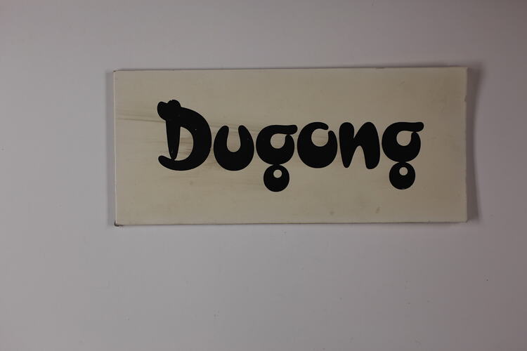 Printed Dugong exhibition label on card used for display at National Museum of Victoria, circa 1985.