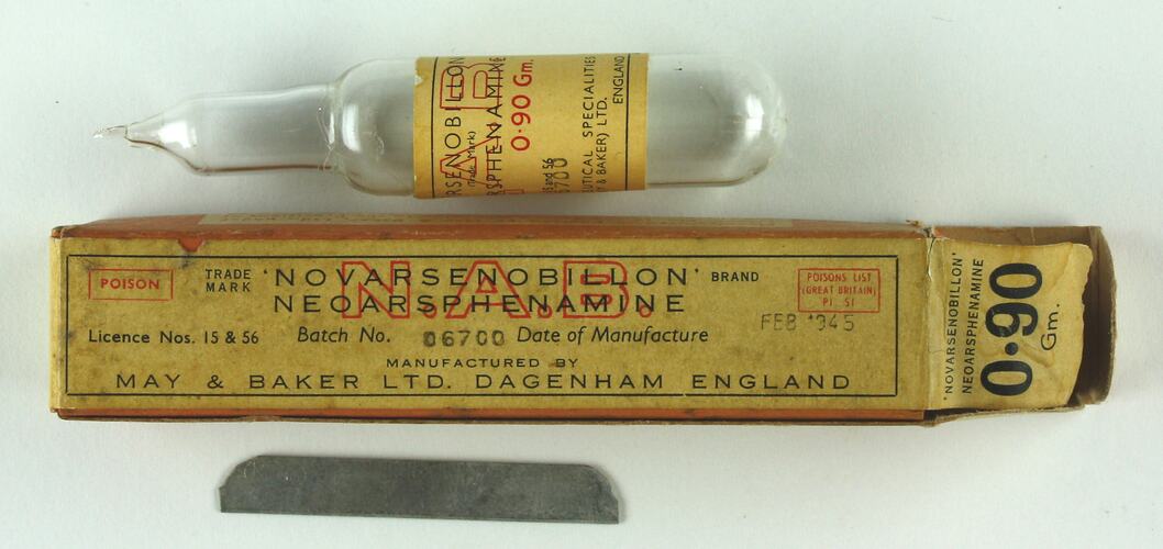 Drug, Novarsenobillon (Neoarsphenamine), manufactured by May & Baker Ltd., Dagenham, England, 1945. Stocked in the pharmacy of a mental health hospital in Victoria, Australia. Novarsenobillon was the trade name under which the drug was marketed by May & Baker, the active ingredient being neoarsphenamine.