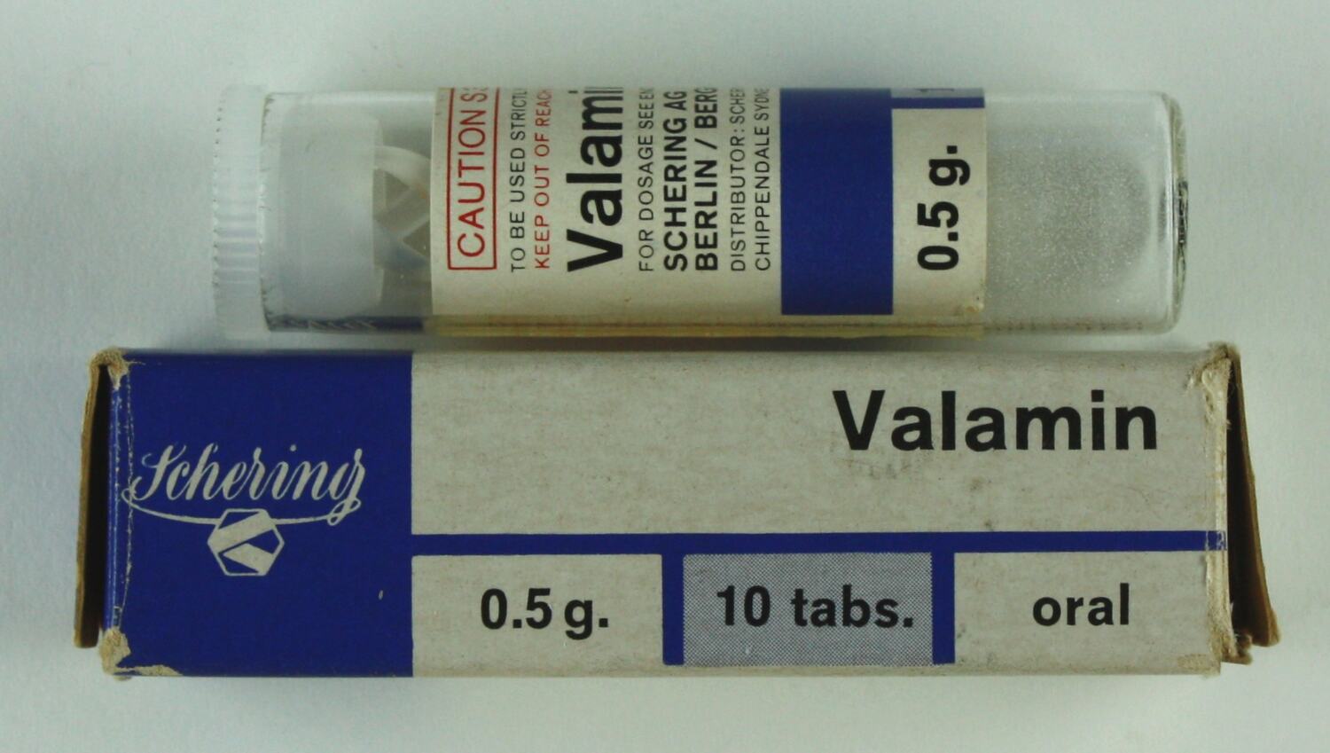 Drug - Valamin (Ethinamate), Schering AG Berlin, circa 1950. Drug - Valamin, made by Schering AG Berlin and distributed in Australia by Schering Pty. Ltd. Sydney. Valamin is the trade name for the active ingredient Ethinamate, a sedative-hypnotic. Stocked in the pharmacy of a mental health hospital in Victoria and administered to patients suffering from insomnia or other sleep disturbances.