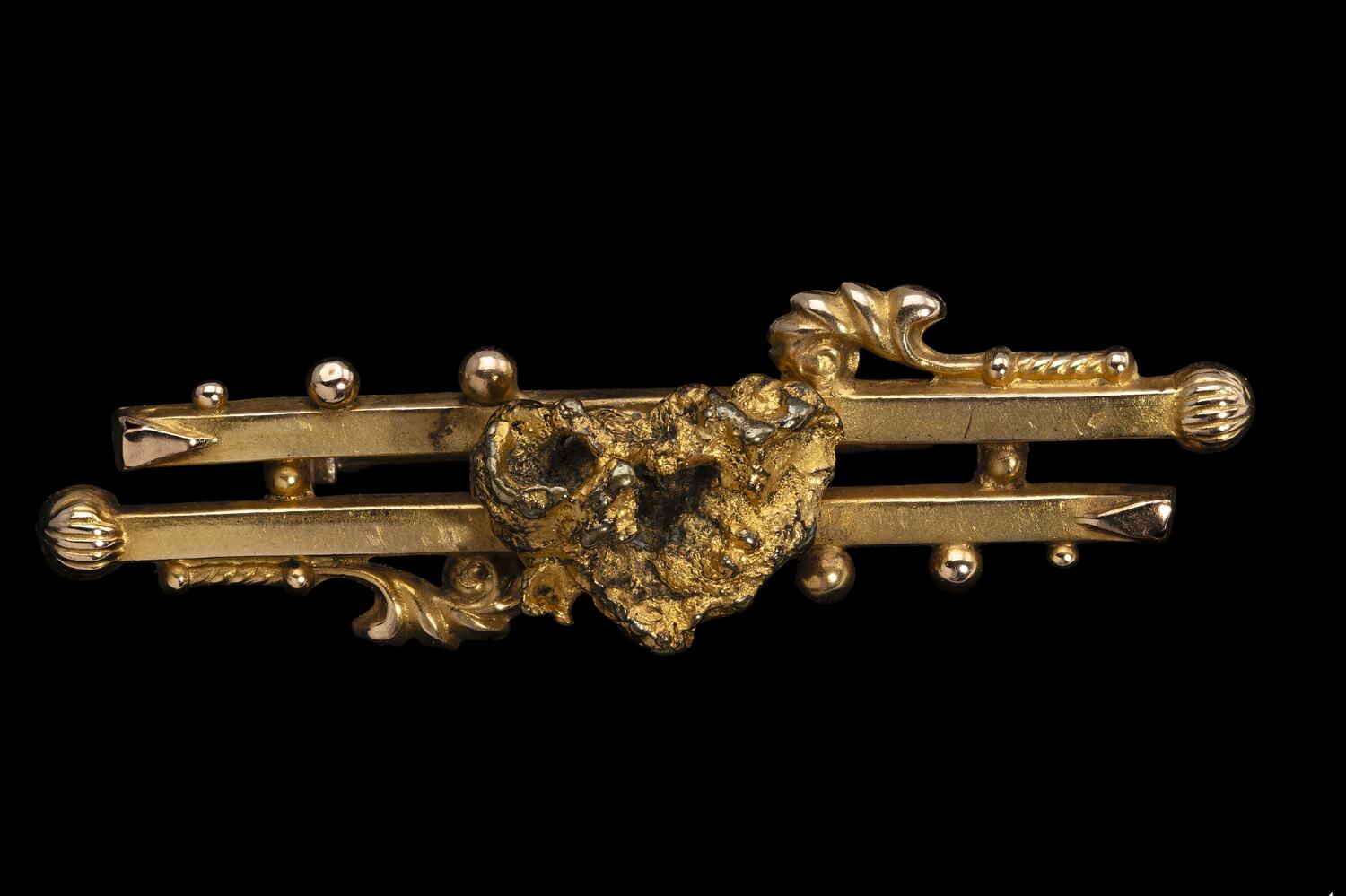 Simple in form, they mostly comprised the mounting of a raw nugget on a plain gold base or parallel bars of gold, sometimes embellished with some swirls or finials.
