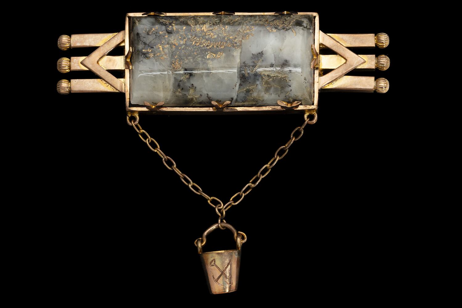 Triple bar brooch with central quartz and gold specimen with small gold bucket with pick and shovel design attached via chain.
