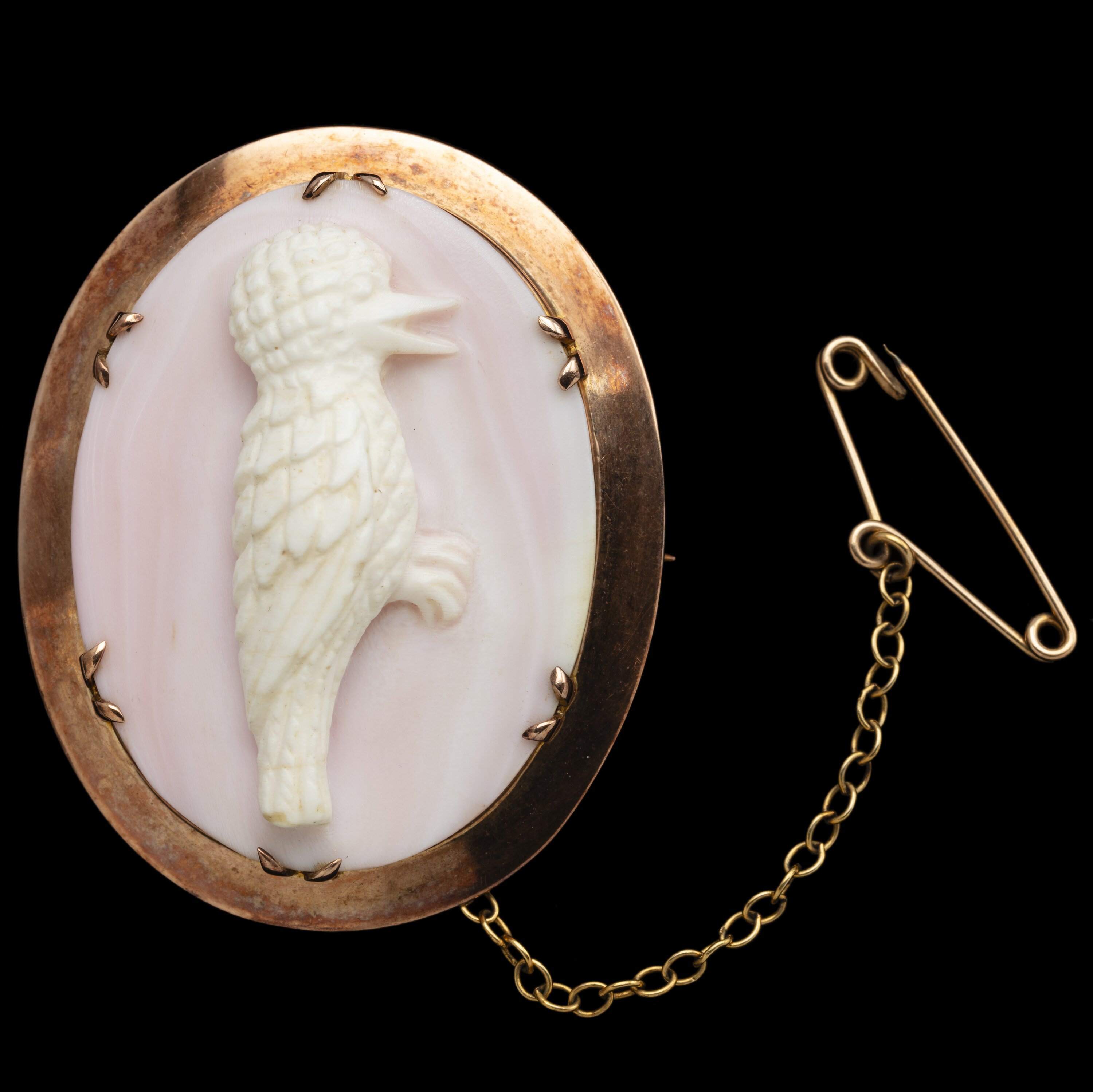 Pink shell cameo brooch with kookaburra in a 9ct plain gold setting by Joseph Lawrence of Melbourne, circa 1900.