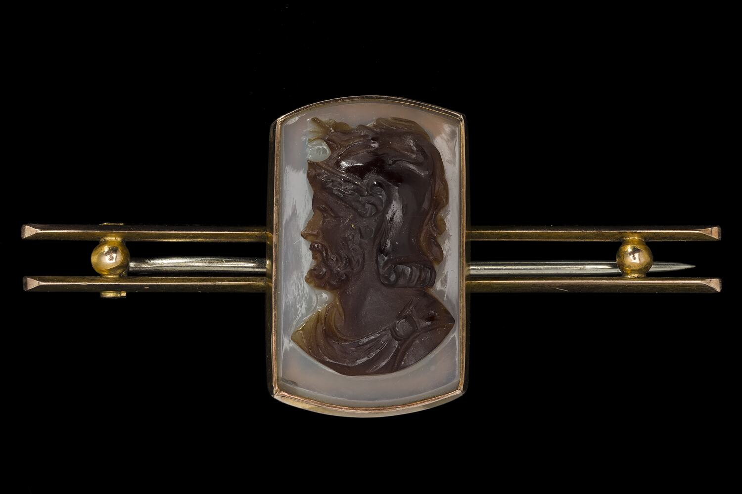 Gold bar brooch with centrally placed, rectangular cameo. Made of dark brown hardstone the cameo features a bearded male bust facing left with a lighter brown background.