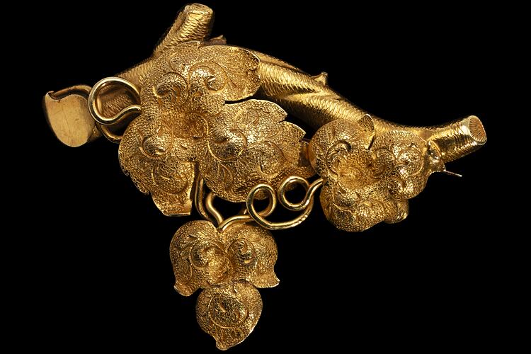 Gold brooch with vine leaves on a branch, made by William Lamborn, Melbourne, circa 1855.