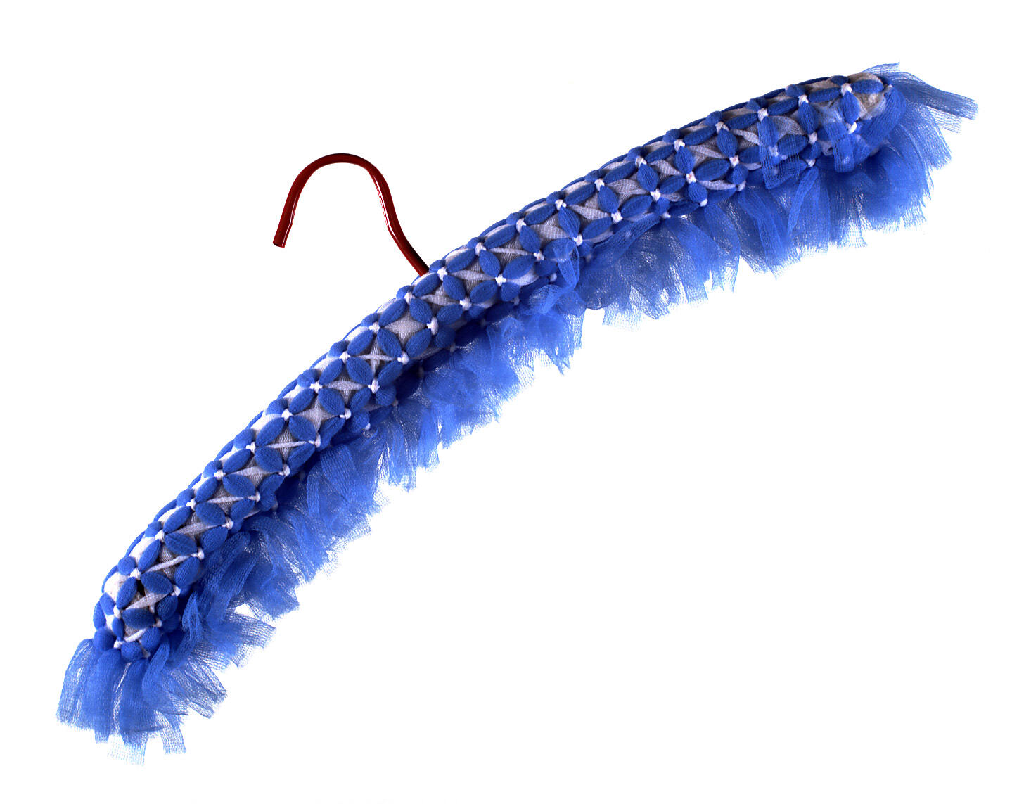 Red plastic coat hanger with a blue and white nylon cover. The hook is metal with a crimson red flexible tube covering it. The hanger section is entirely covered with blue and white strands of nylon netting. The white strands have been wrapped around the body, padding it out. The blue strands have been wrapped around to form crosses. The white strands are knotted in the centre of the blue crosses. The blue strands hang down as a fringe.
