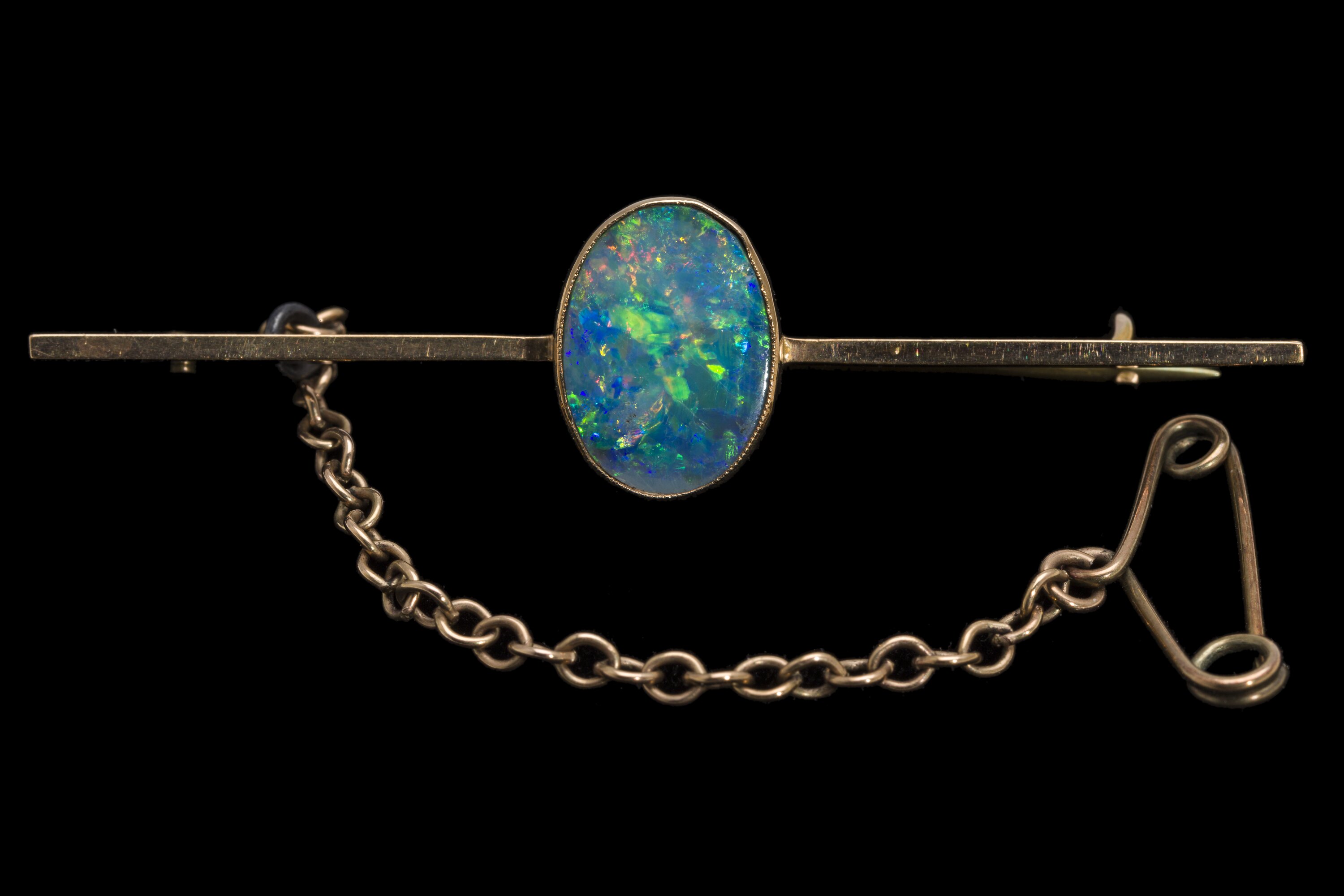 Oval triplet opal set in a gold frame on a long narrow bar of gold. A fine gold safety chain is attached to the brooch.