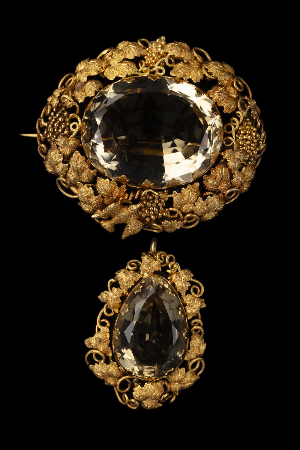 Brooch set with an oval citrine surrounded by gold bunches of grapes and scrolling grape vines and a swallow, with a similarly set pendant drop set with a pear shape citrine.