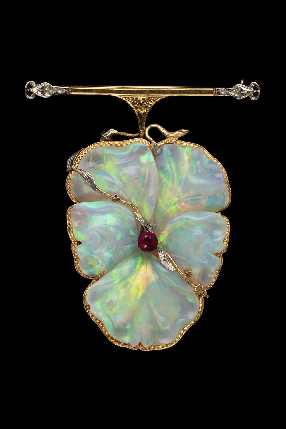 The opal was sourced from the White Cliffs opal fields in New South Wales, and the central red adornment is of red paste rather than a gemstone - this was not uncommon during this period, due to the lack of supply, as the costs and the security required to bring precious stones from abroad were prohibitive.