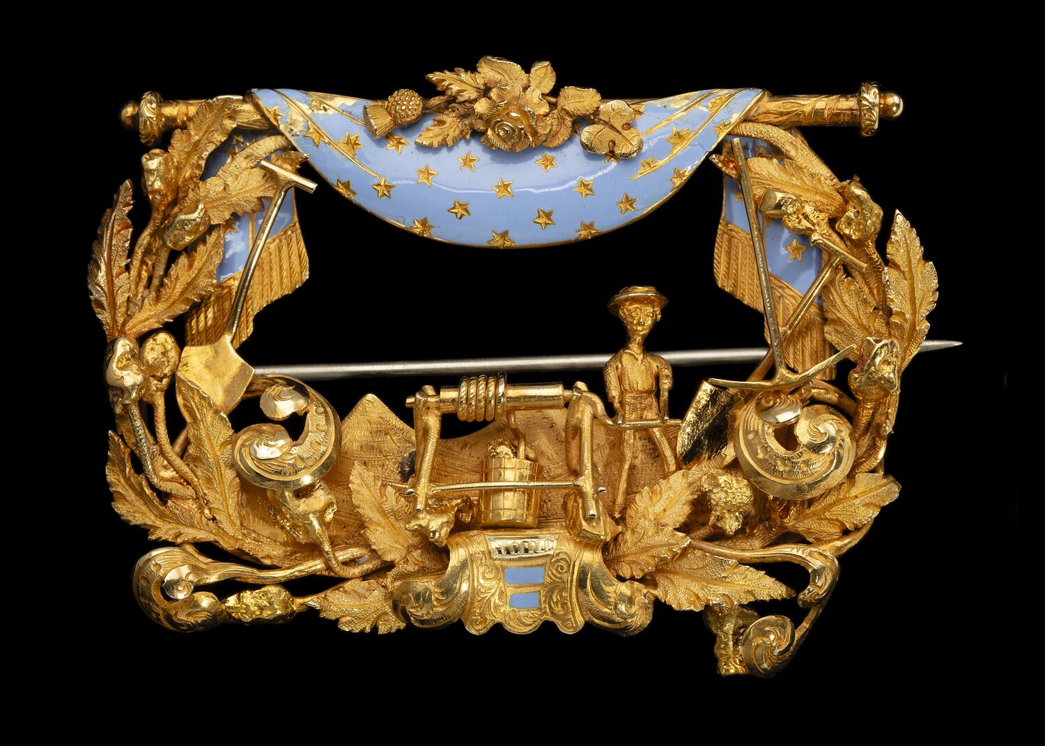 Large gold and enamel rectangular brooch with openwork design featuring a miner at a windlass, flanked by a pick and shovel on each side of the brooch. The decorative wreath-like framework features ferns and small gold nuggets. At the top of the brooch is an enameled blue curtain with gold fringing, draped over a golden rod and toped with a thistle (Scotland), rose (England), and a shamrock (Ireland).