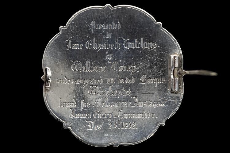 The inscription on the back plate reads: "Presented to Jane Elizabeth Hutchins by William Carey, made and engraved on board Barque Winchester, bound for Melbourne, Australia. James Curry, Commander, Decr.25th 1852."
