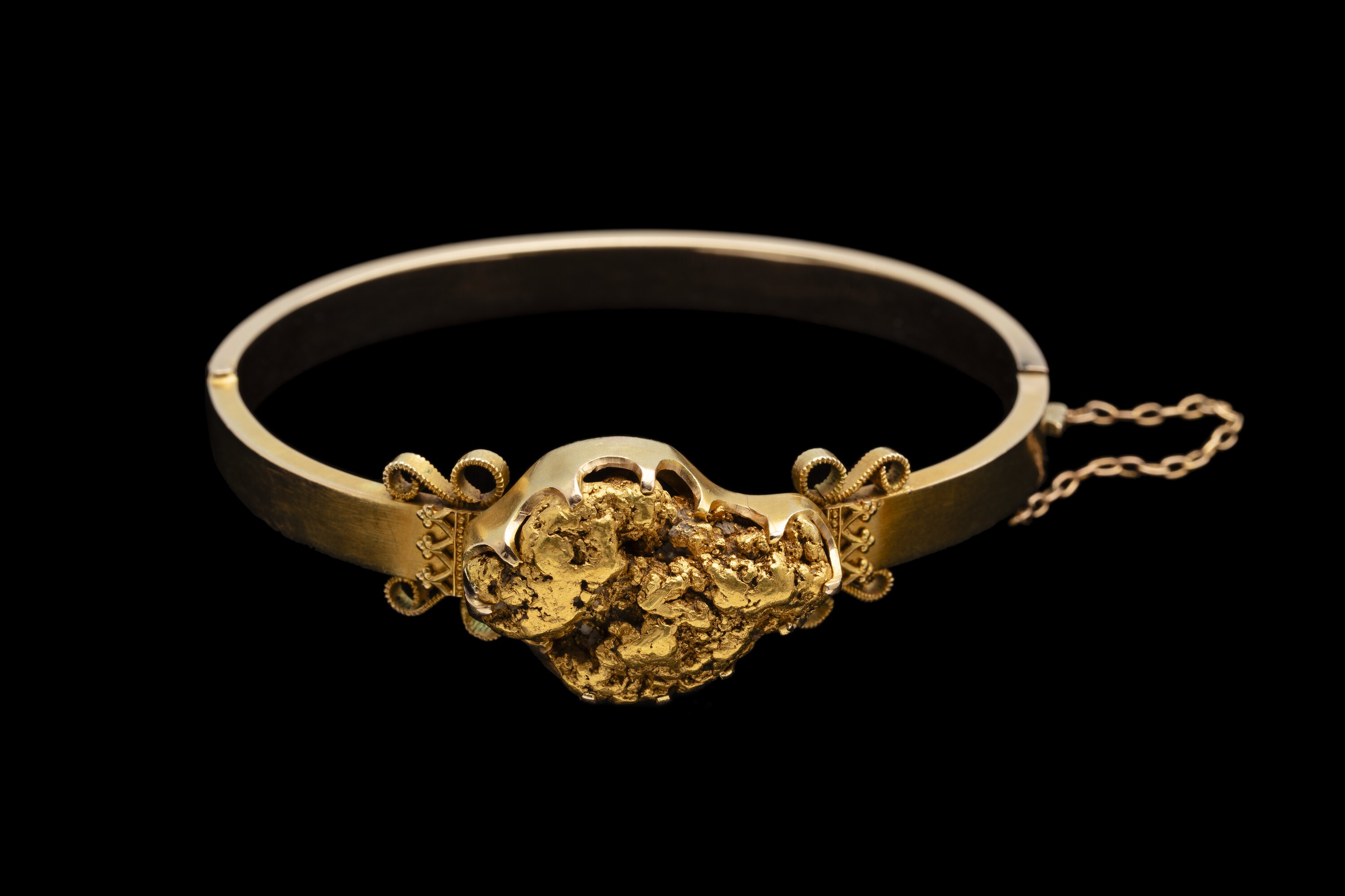 15 carat gold bangle (bracelet) featuring a large gold nugget by an unknown jeweller, made about 1870. While the maker is unknown it was probably made in Melbourne, as following success on the Victorian goldfields many miners made the journey to Melbourne to spend their newly found wealth, often incorporating some of the gold they had discovered.