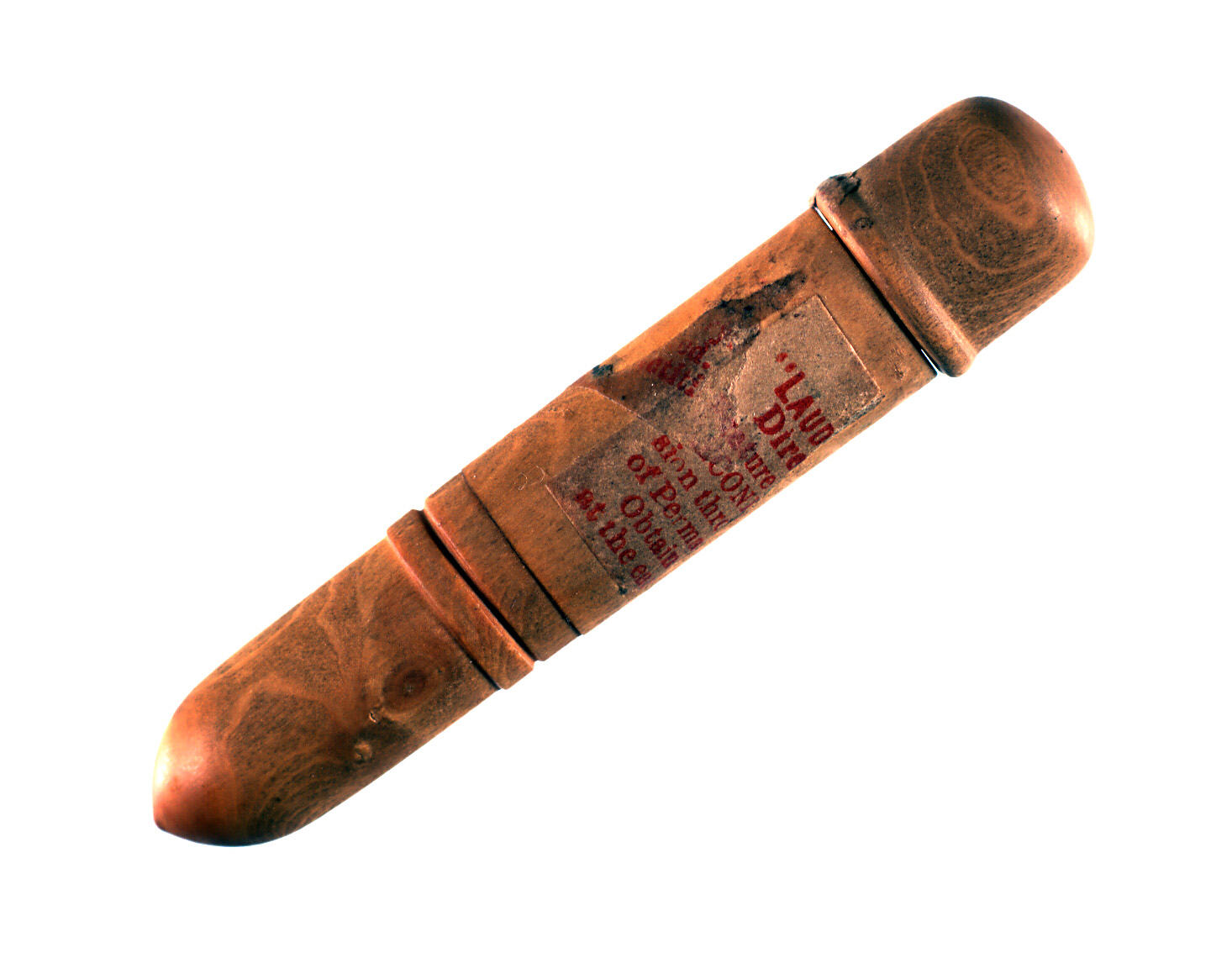 Small wooden cylindrical object in three parts. .1 is a small, rounded screw on top with a slightly raised rim. .2 The cylindrical body is made from smooth polished wood; there are the remains of a label on the outside. One end is open and screws into .1. The other end has a metal pointy object protruding from it. .3 Is a cylindrical, bullet shaped lid which covers the metal protrusion. It has a carved rim.
