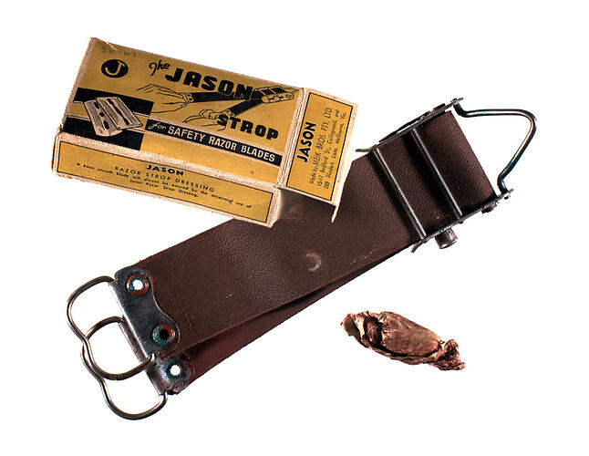 Printed on box: 'The Jason Strop for safety razor blades. Jason Made by Meik Bros. Pty. Ltd. 15-17 Bedford St., Collingwood & 289 Flinders Lane, Melbourne, Vic. Fifty Shaves with one blade...'