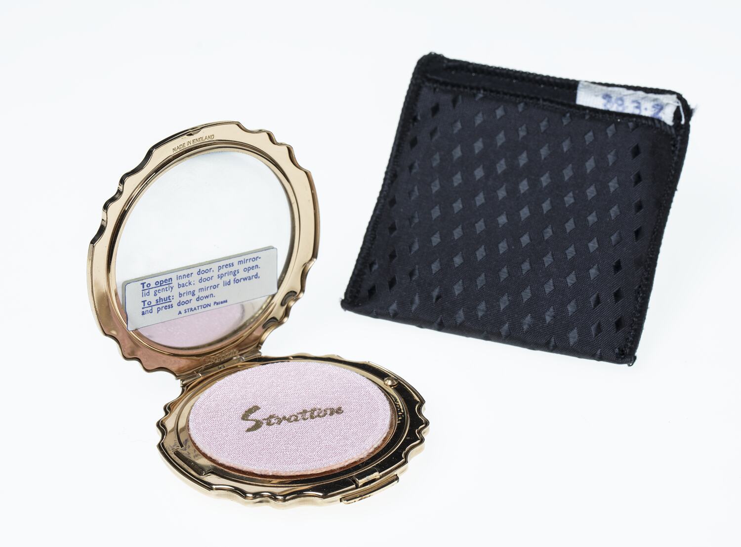 Powder compact, metal with black and white enamelled upper surface showing abstract criss-cross design. A round mirror on the inside lid is inscribed 'Made in England' at the top and 'Stratton' below. Upon the surface of the mirror is a sticker with instructions for opening and shutting the compact, and 'A Stratton Patent' printed below. In the dish on the bottom half of the compact sits a pink powder puff. Engraved in the centre of the dish is the word 'Stratton' and a picture of a hand holding an open compact. The dish can in turn be raised to reveal a gauze bed in which powder is placed. The base of the compact is decorated with a star pattern in gold coloured metal. The compact is still in its original box. .2 Black material pouch for .1 with diamond pattern.