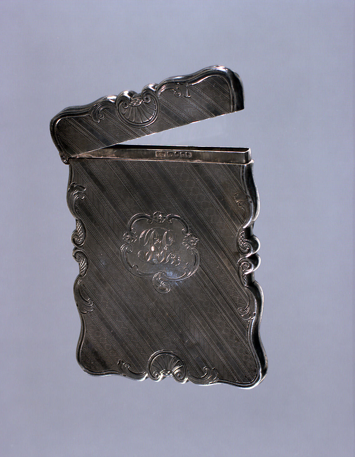 Calling card case, one of two donated by the donor. They probably belonged to the donor's aunt, Mrs Rosetta (Rose) Biggins, nee Aarons, the wife of a wool broker who lived in St Kilda. The donor remembers driving with her aunt and running in to deliver a visiting card while her aunt remained in the chauffeur-driven car, around 1914 -1920. Cards delivered this way were left with member of the house staff, such as a 'servant girl'.
