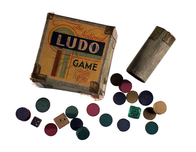 Board game, comprising: Ludo board - multi-coloured with four lots of four different coloured circles, enclosed by a square in each corner, and a square in the centre, divided into four different coloured sections. Dice and counters - 16 small wooden counters (4 green, 4 purple, 4 pink and 4 yellow). Also two extra counters slightly larger and different - 1 green 1 purple. Also 3 dice, probably not original: 1 plastic, 1 home-made wood and 1 small wooden die with white painted markings. Dice cup - narrow cardboard cylinder, mended at the base with sticky tape. Box lid - lid of small box for holding dice, counters and dice cup. Box bottom. The game box is in poor condition and is held together with adhesive tape.