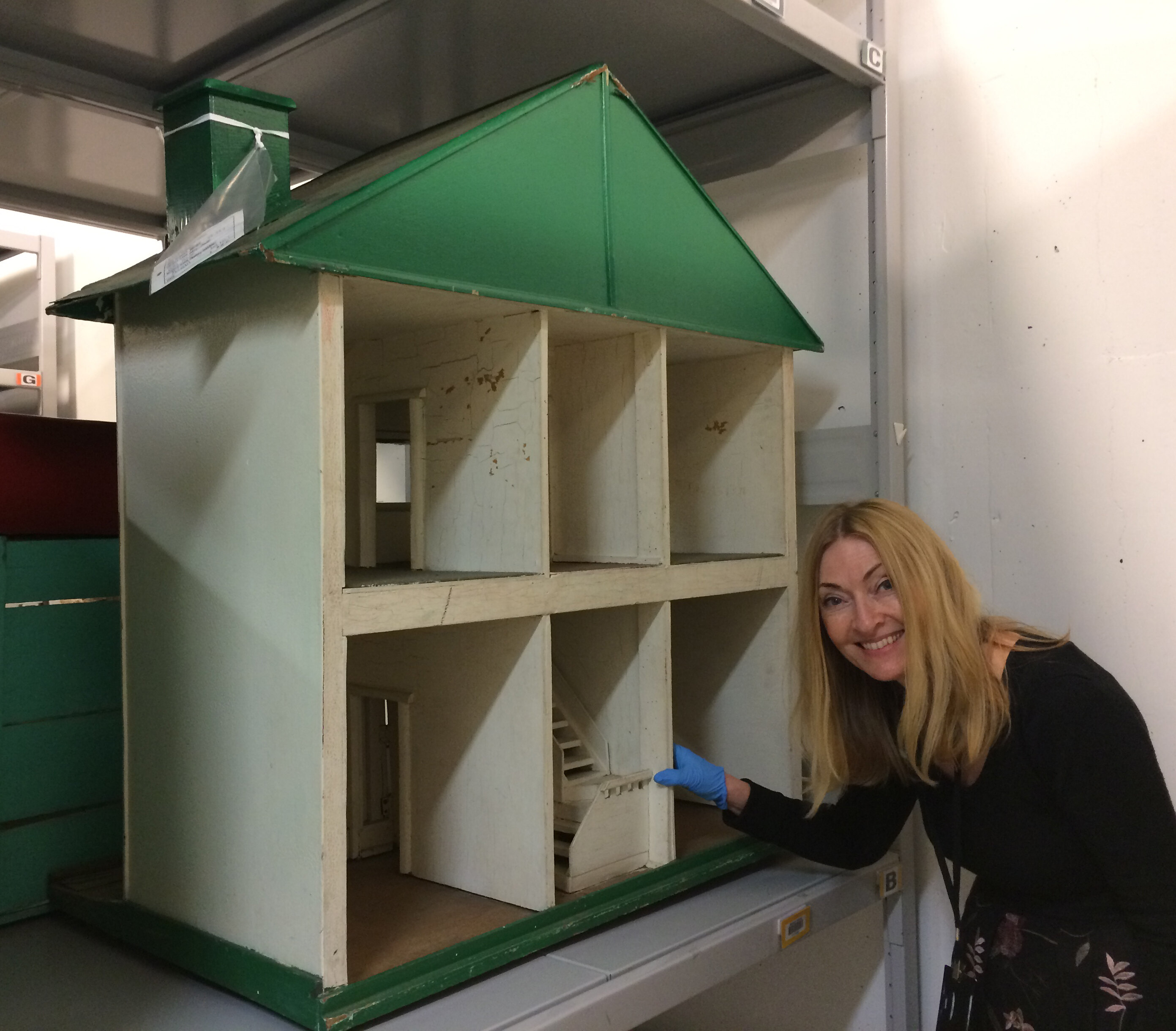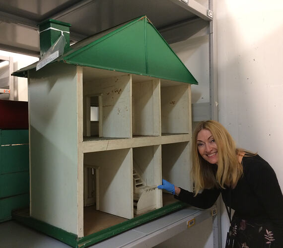 Simply-constructed white wood doll's house, two storeys, with green roof, table, chimney and base. Closed front facade; open back of doll's house provides access to the rooms inside. Two rooms downstairs and two rooms upstairs, with a central stairwell between them.