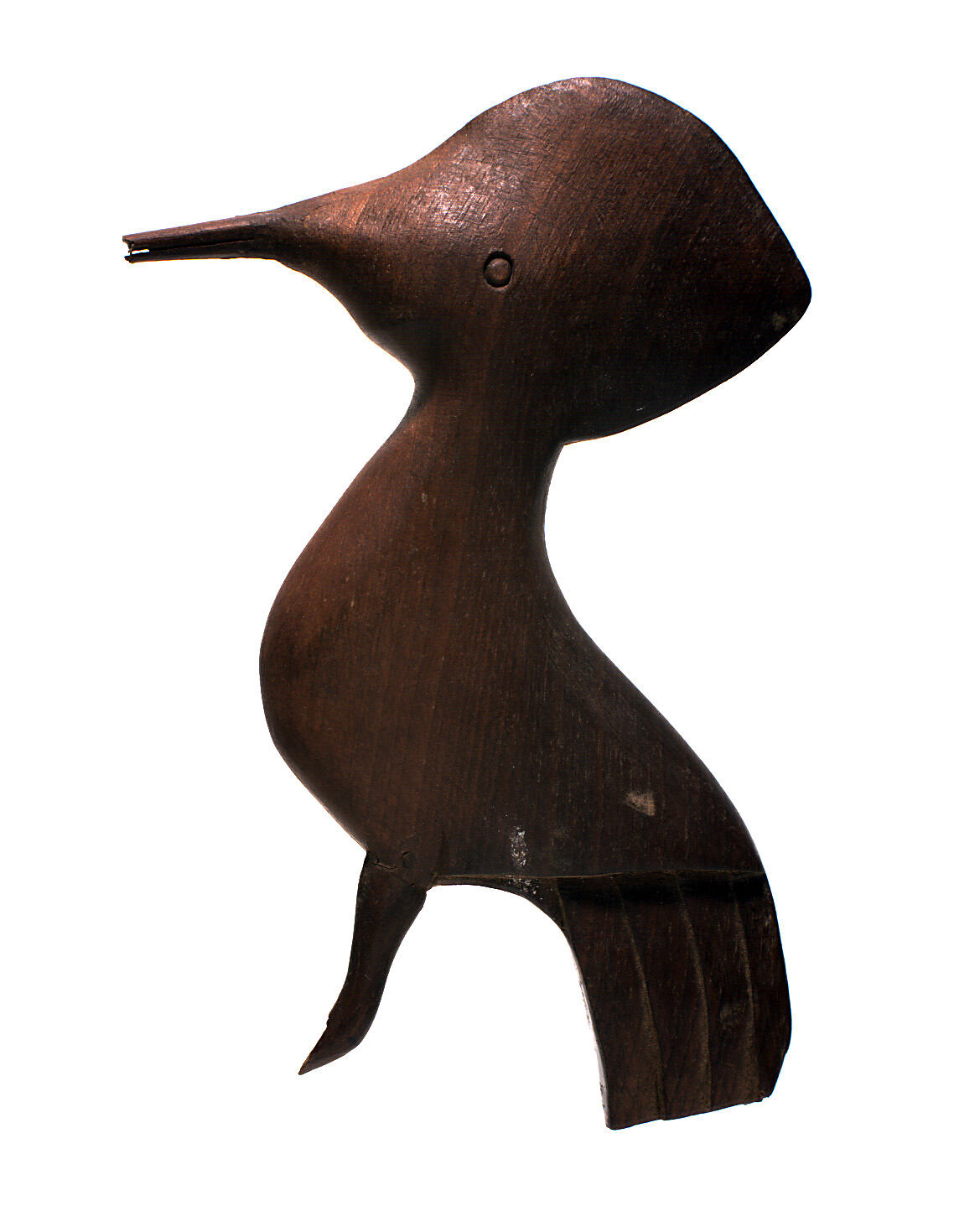 Lightweight, dark brown wooden bird. Bird is thin with eye on either side represented by small grooved circle; long very thin round beak which has been broken off. Body is smooth; tail points downwards; four layers of feathers; one thin broken leg. Found in Area A of workshop.