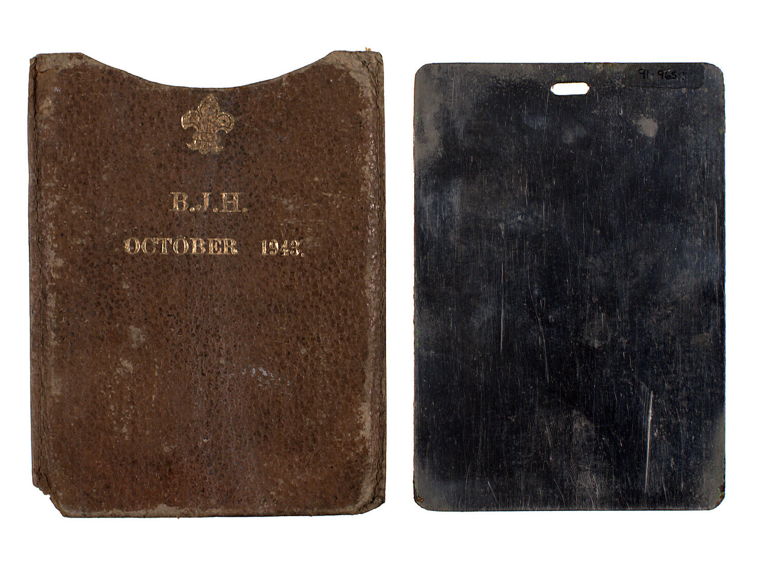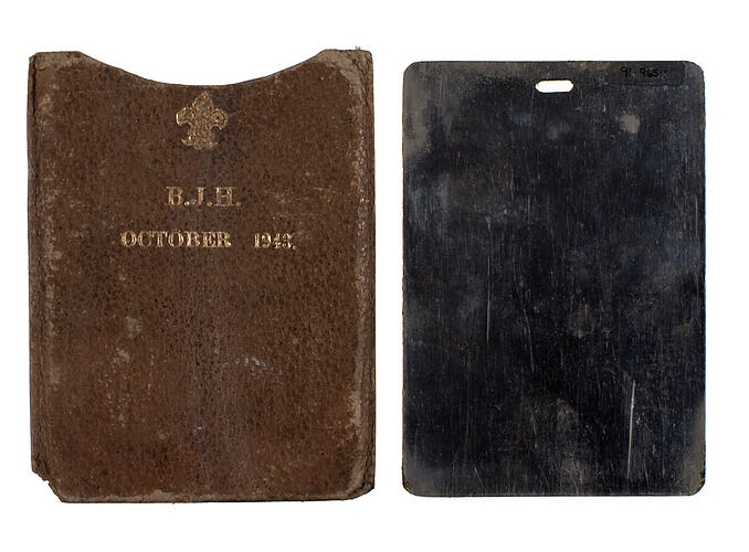 Rectangular shiny heavy metal, mirrored surface on both sides, contained in a cardboard but leather-look slip case. The case is embossed in gold with the Scout logo, the initials "B.J.H." and the date, October 1943. There is a small hole at the top of the piece of metal, to enable it to be gripped easily when removed from the case. .1 metal mirror .2 cardboard case