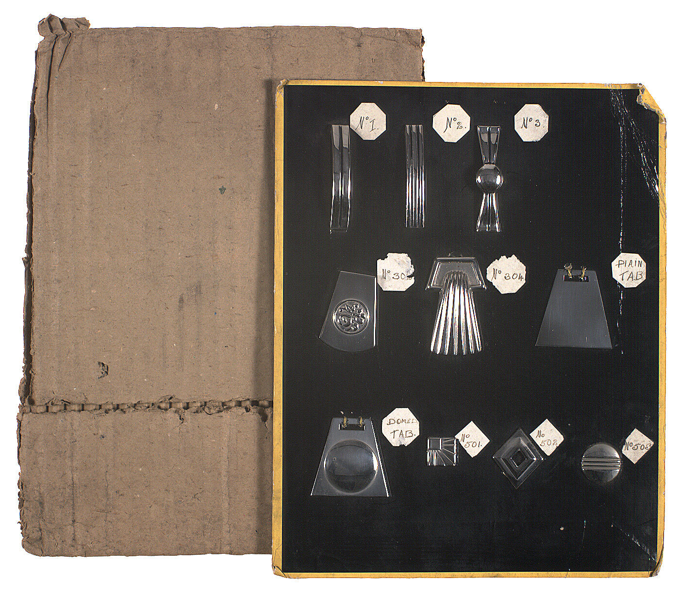 .1 Card holding ten metal handbag decorations. Silver in colour. Each is numbered and two are described as "Plain Tab" and "Domed Tab". .2 Corrugated cardboard wrap for card.