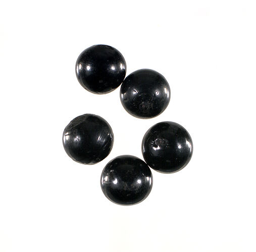 Five black ceramic balls that are not perfectly spherical with areas that are rough from manufacture.