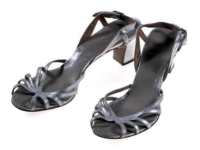 Pair of silver slingback woman's sandals, made by Holmes. Worn at the Toorak, Melbourne, wedding of the donor, Christobel Mattingley. She was married on 12 December 1953.