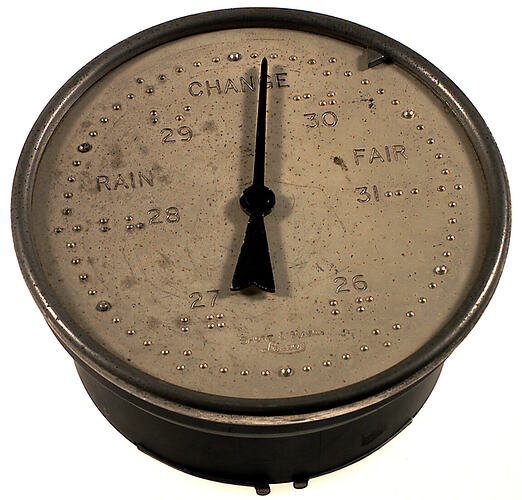 Plated tin barometer with Braille markings. The sides, back and the arrow indicator are black. Round face, with handle for hanging on the wall. The words "Change/Rain/Fair" are etched into the metal on the face of the barometer; also the numbers 29/30/28/31/27/26, along with raised Braille symbols next to the numbers.