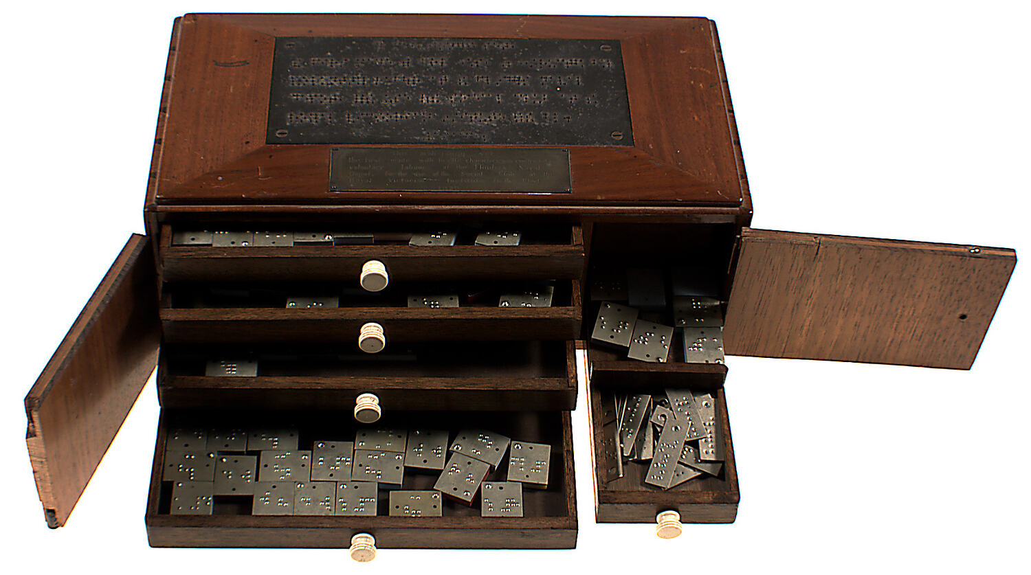 Wooden cabinet with two doors, 4 shallow drawers on the left and 2 small shallow drawers on the right. Top drawer has 40 pieces, of various colours (mostly blue) plastic material with metal tops with raised dots (Braille figures). 2nd drawer - 38 pieces; 3rd drawer - 33 pieces; 4th drawer - 19 pieces. Small top drawer on r. contains 8 pieces; bottom drawer - 58 small rectangular metal pieces with a hole at one end & raised dots on them.