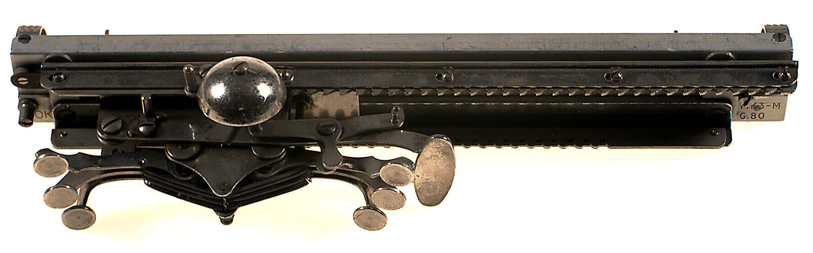 This Braille Writer was one of the models sometimes called "crab writers" for their sideways movement and six keys that extend, three on each side of the carriage.