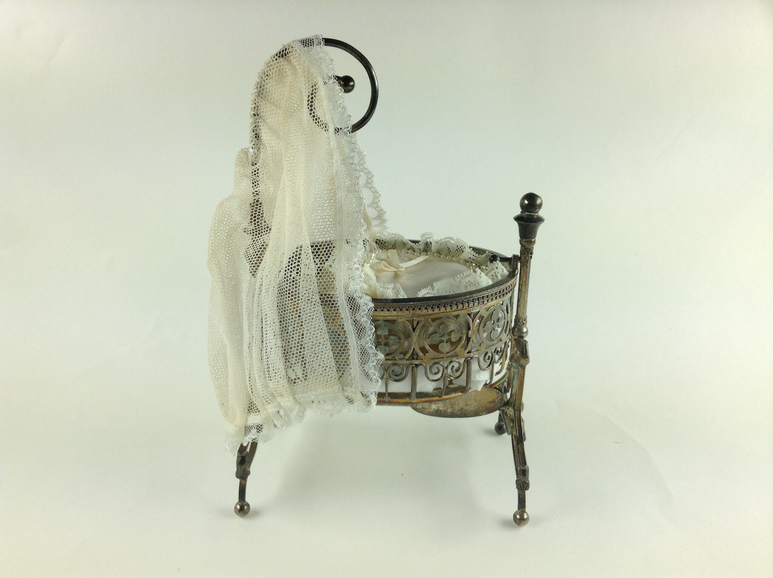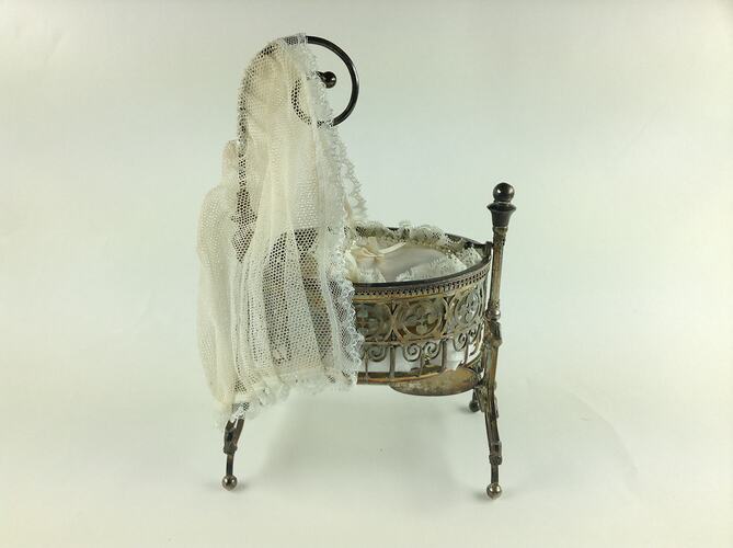 Small ornament in the shape of a baby's cradle suspended on a frame and with a metal support for a miniature hanging curtain. The cradle contains two tiny dolls, dressed in cream-coloured material with white lace trim lying on a satin cushion with pearl and lace trim, under a coverlet with pearl, lace and ribbon trim. There is a net curtain at the head of the cradle. The body of the cradle is finely patterned metal, apparently silver, and the stand is also finely wrought. At the base of the cradle is an engraved plaque.