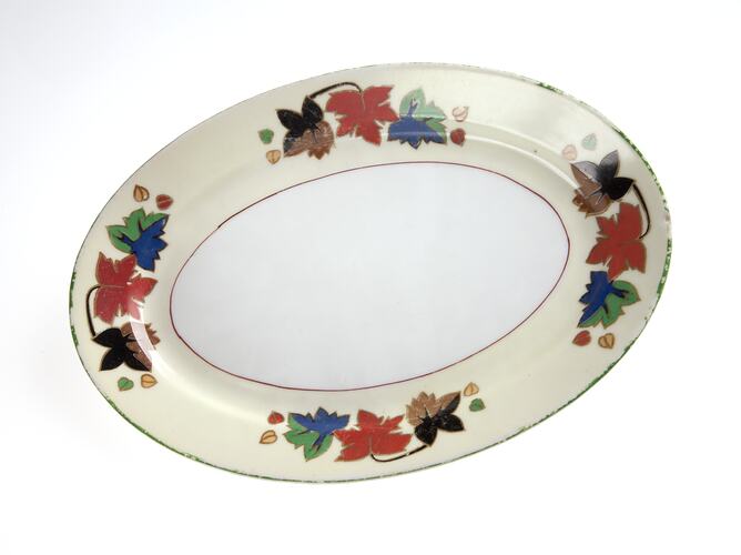 Oval ceramic Dish. Cream border, edged with green on the outside and red on the inside. Within the border are four sets of three maple leaves. The maples leaves are brown and black, red and blue and green, all are outlined in gold. The centre of the plate is white.