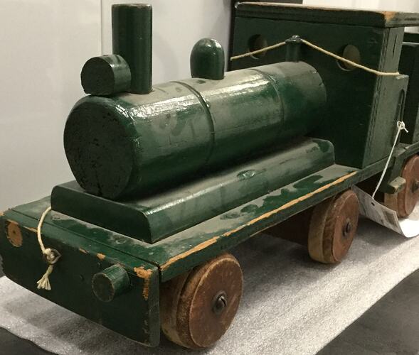 Wooden pull-along train engine with open cabin. Acquired as part of a private collection of Australian hand-made toys. The specific provenance of the engine is unknown; however, its appearance suggests it dates from the early 20th century.