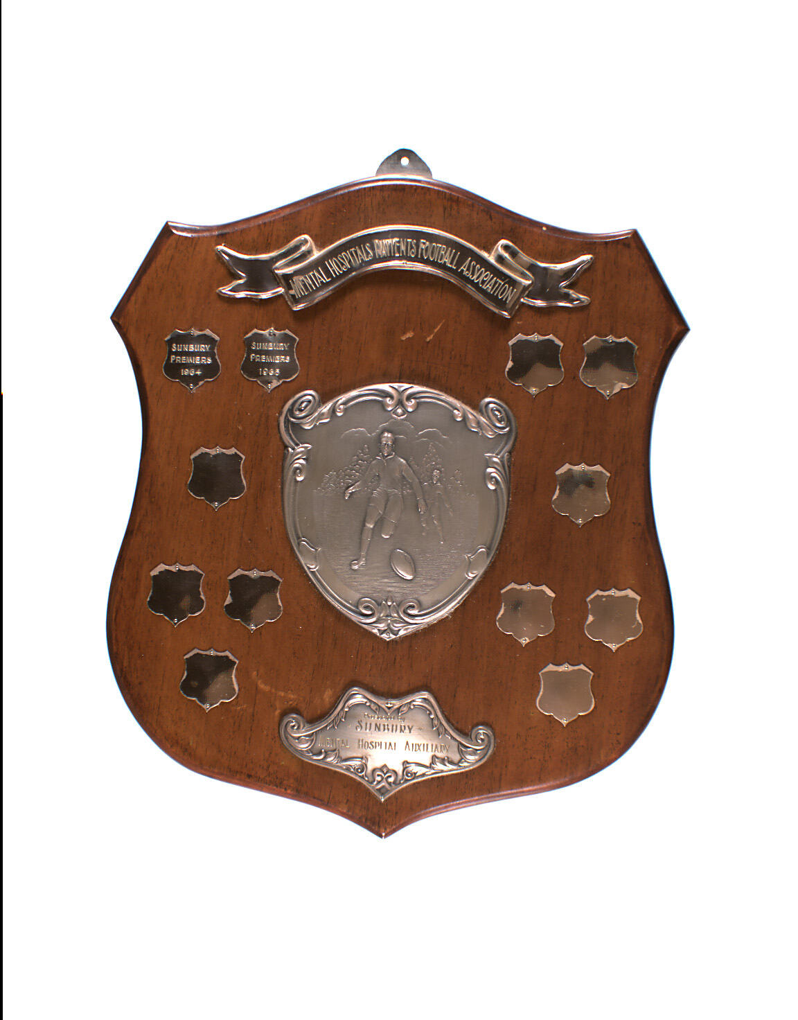 Brown wooden sports shield, irregular shape. Dull grey metal plaque has been screwed and glued to centre. This features relief images of two men playing football on field. Above and below plaque are two further grey metal plaques, screwed and glued to the shield. Down each edge of shield are six small plaques. Only the top two at u.l. have been engraved. Silver plating flaking from the edges of these twelve plaques. Shield is hung from grey metal hanger screwed to top of reverse side.