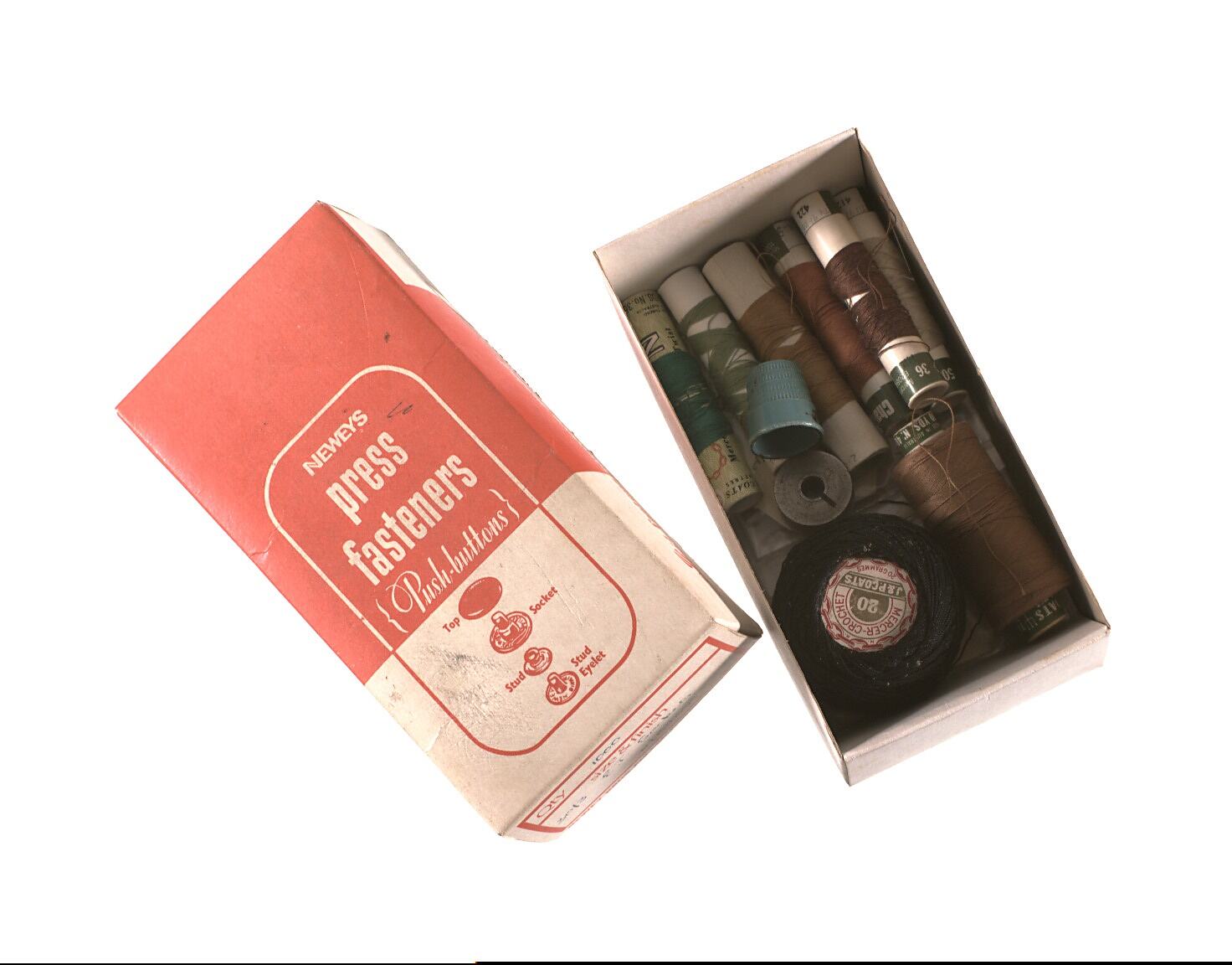 Red and white cardboard box that used to contain press fasteners, has been used to store reels of thread and other haberdashery items.