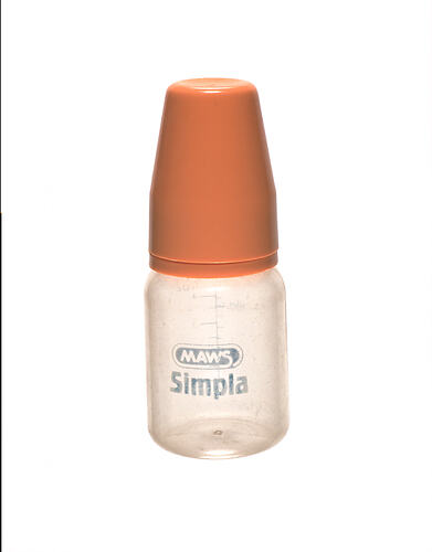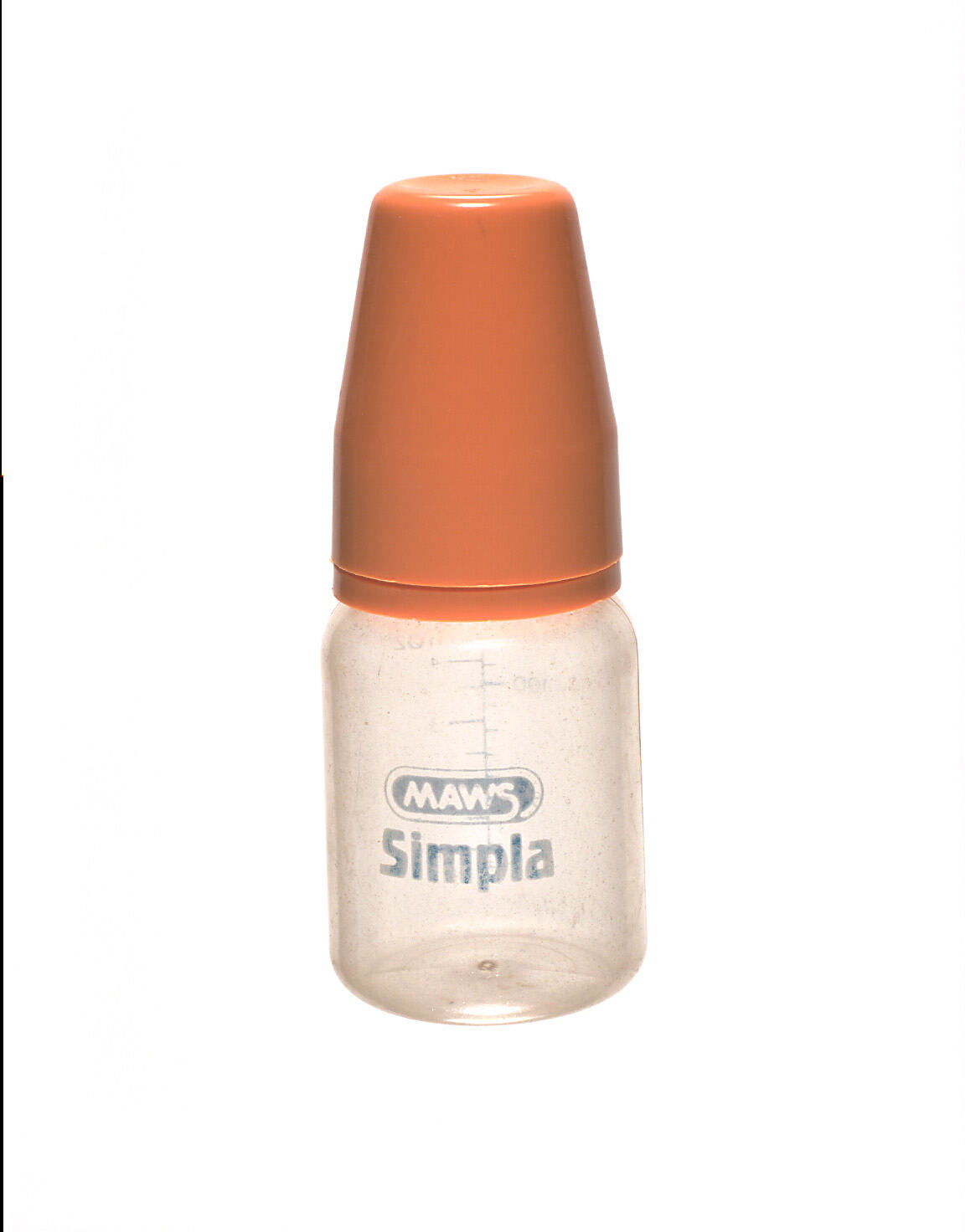 Printed on bottle: MAWS/Simpla. BOILED/&/STERILISED. On back, vertical line: 50, 100, 150, 200, 240. In numerals with 2 ml. marks between each figure. The words MILLILITRES (MLS) printed sideways and vertically.