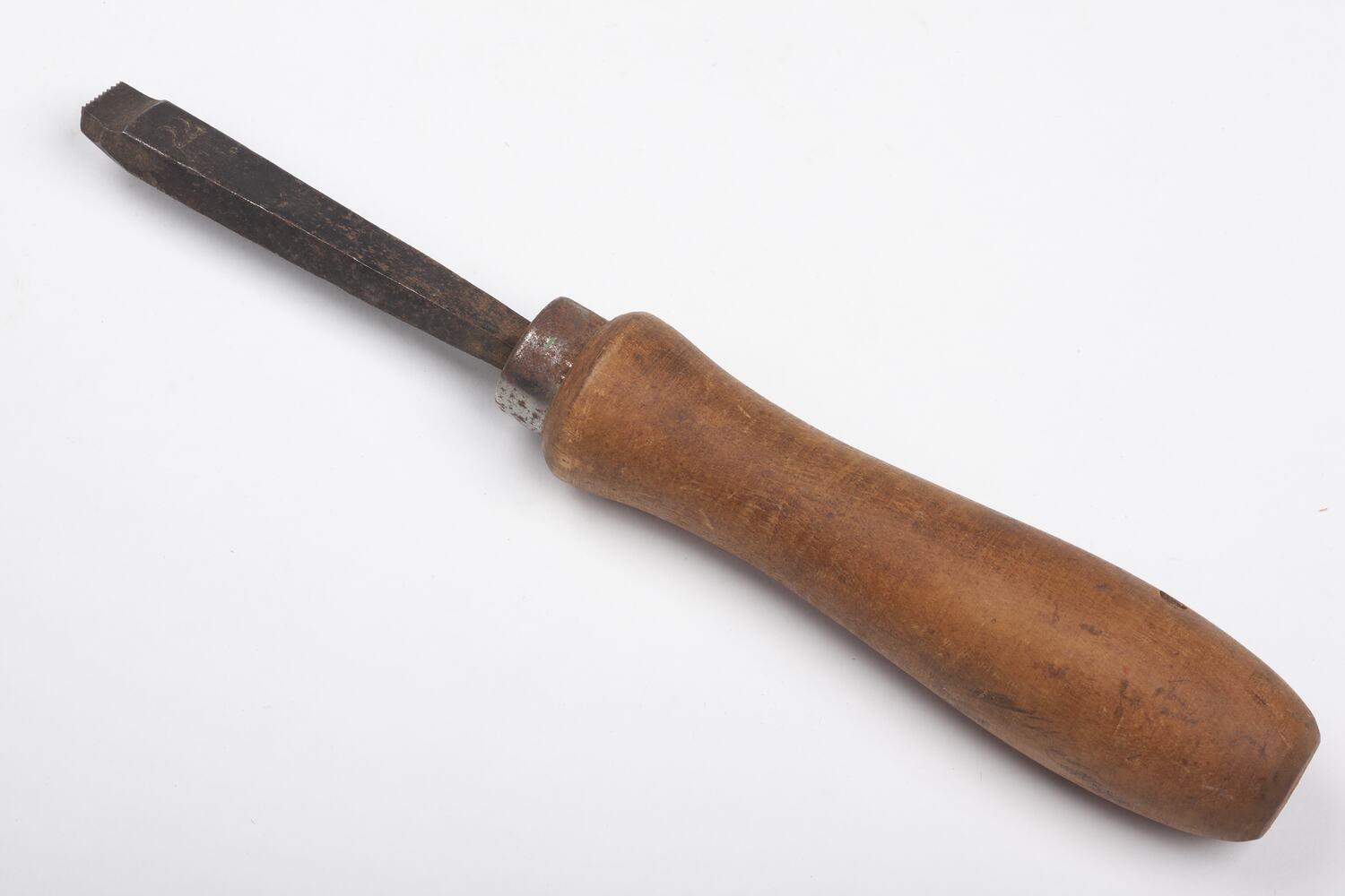 Scraper circa 1890s-1950s. It was found in Area B1 at Adolph Bruhn & Son's Wood Turners Shop, 283 Coventry Street, South Melbourne. The business was established by Adolph Bruhn circa 1893 in Little Collins Street, Melbourne. Upon his death in 1919 it was then operated by Adolph's son Sophus Christopher Bruhn. Upon Sophus's death in 1959 his son Sophus Walter Bruhn took over the business. In 1970 Sophus reduced the scale of the business and relocated to South Melbourne. The business closed upon Sophus's death in January 1990.
