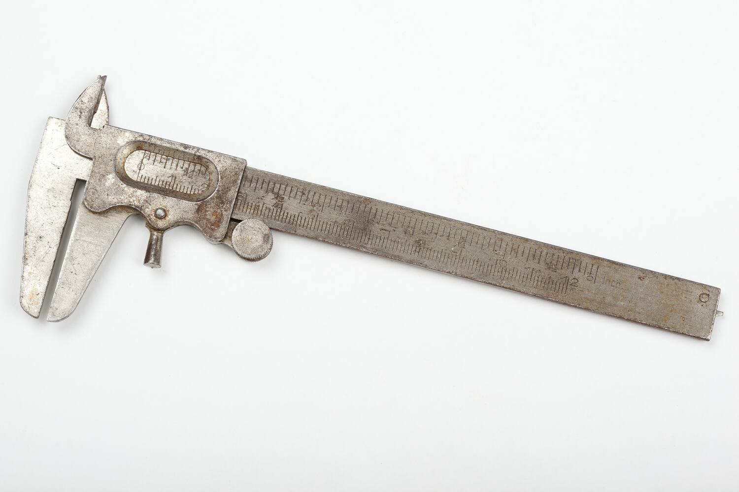 Gauge Caliper circa 1900s - 1960s. It was found in Area B1 at Adolph Bruhn & Son's Wood Turners Shop, 283 Coventry Street, South Melbourne. The business was established by Adolph Bruhn circa 1893 in Little Collins Street, Melbourne. Upon his death in 1919 it was then operated by Adolph's son Sophus Christopher Bruhn. Upon Sophus's death in 1959 his son Sophus Walter Bruhn took over the business. In 1970 Sophus reduced the scale of the business and relocated to South Melbourne. The business closed upon Sophus's death in January 1990.