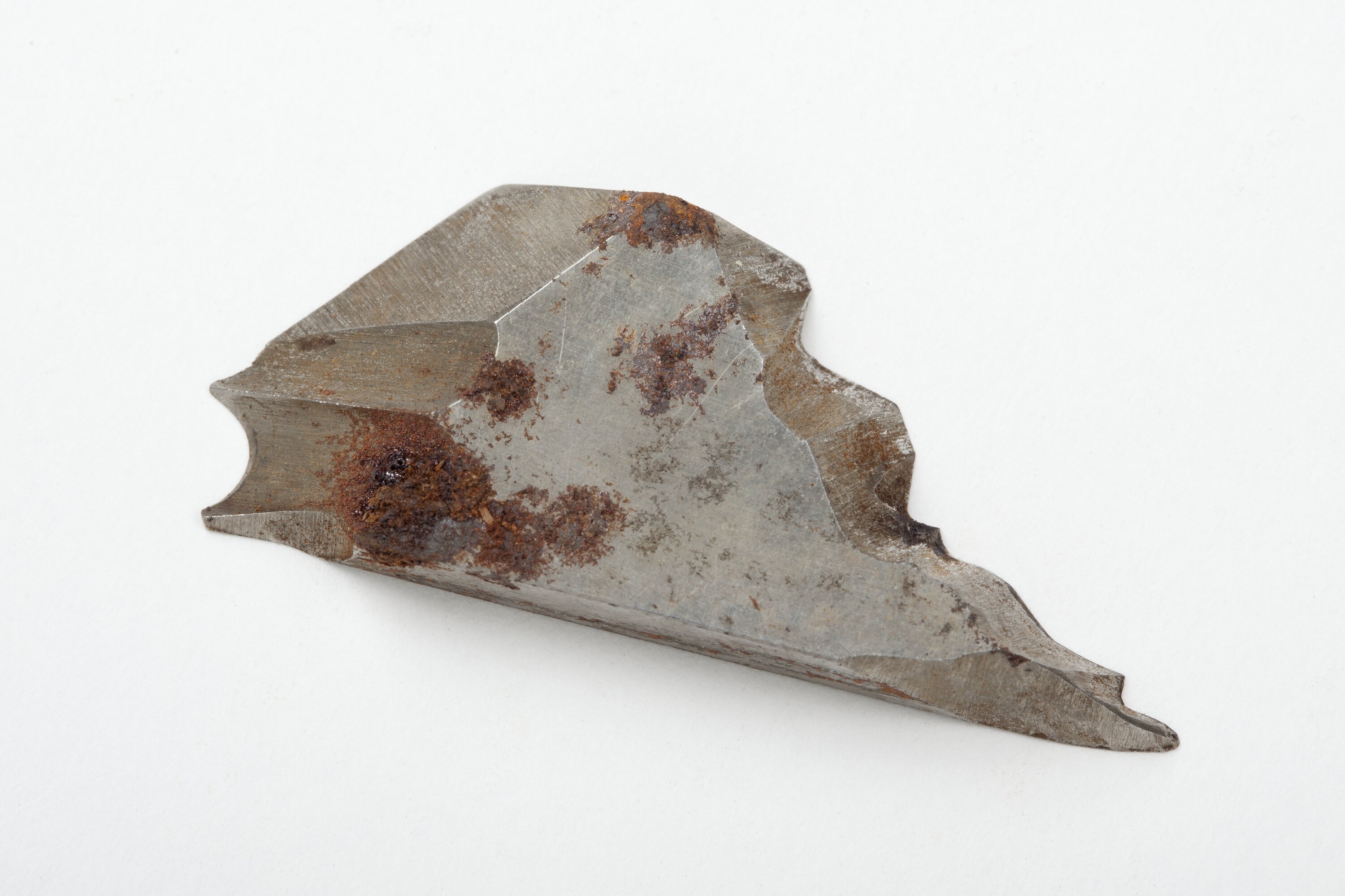 Irregularly shaped blade made from silver metal. Base and top are flat. Two of the edges are straight and smooth whilst the other two are jagged, sloped and sharp. Blade or cutter is fitted into and used as part of the multiplane.
