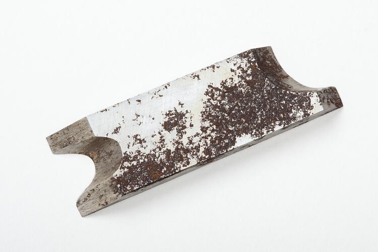 Blade for a hand planer, circa 1970s-1980s. It was found on top the planner in Area D5 at Adolph Bruhn & Son's Wood Turners Shop, 283 Coventry Street, South Melbourne. The business was established by Adolph Bruhn circa 1893 in Little Collins Street, Melbourne. Upon his death in 1919 it was then operated by Adolph's son Sophus Christopher Bruhn. Upon Sophus's death in 1959 his son Sophus Walter Bruhn took over the business. In 1970 Sophus reduced the scale of the business and relocated to South Melbourne. The business closed upon Sophus's death in January 1990.