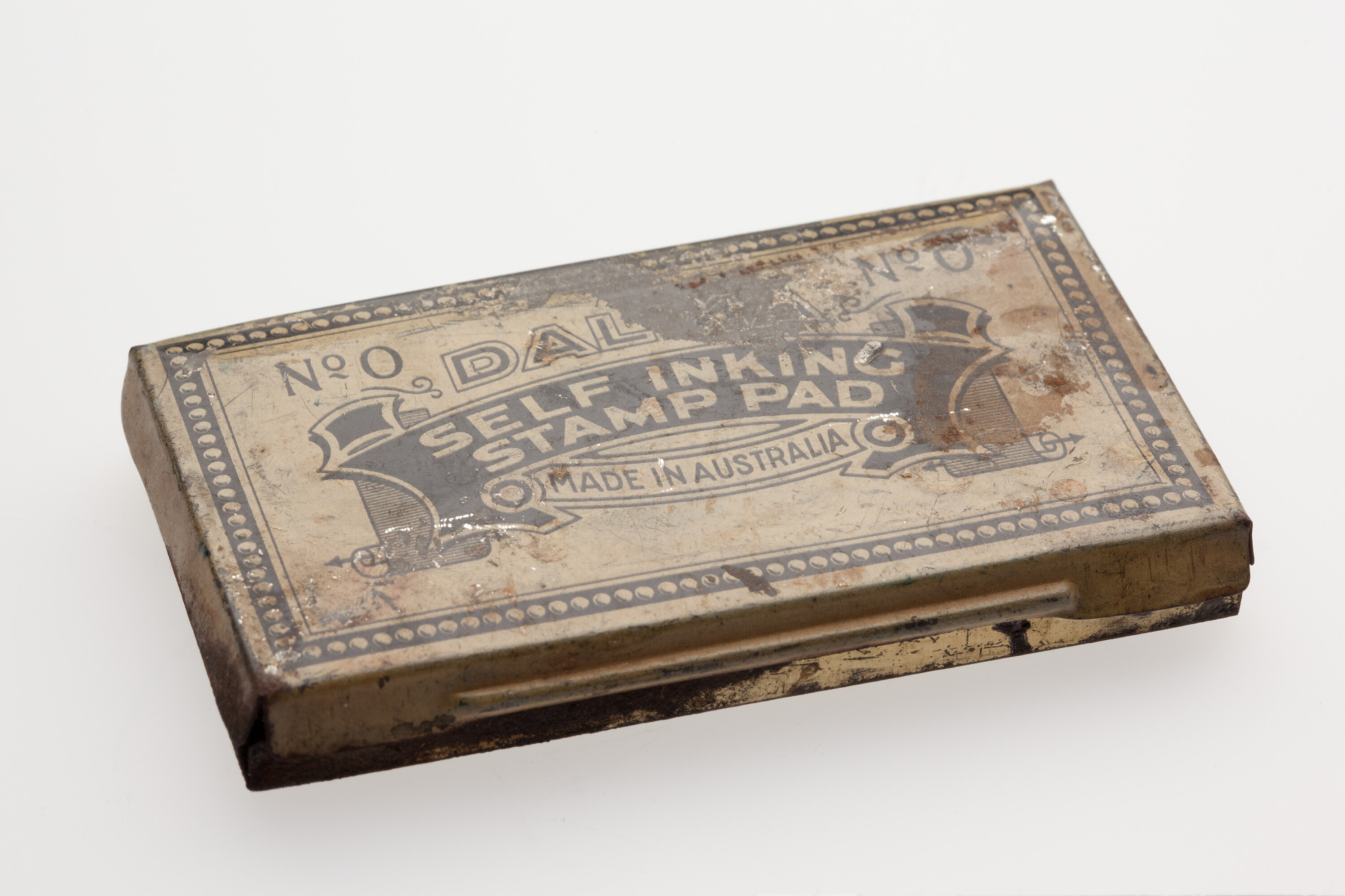 Printed tin lid: NO. 0 DAL (Illegible.) No 0/SELF INKING/ STAMP PAD/MADE IN AUSTRALIA.