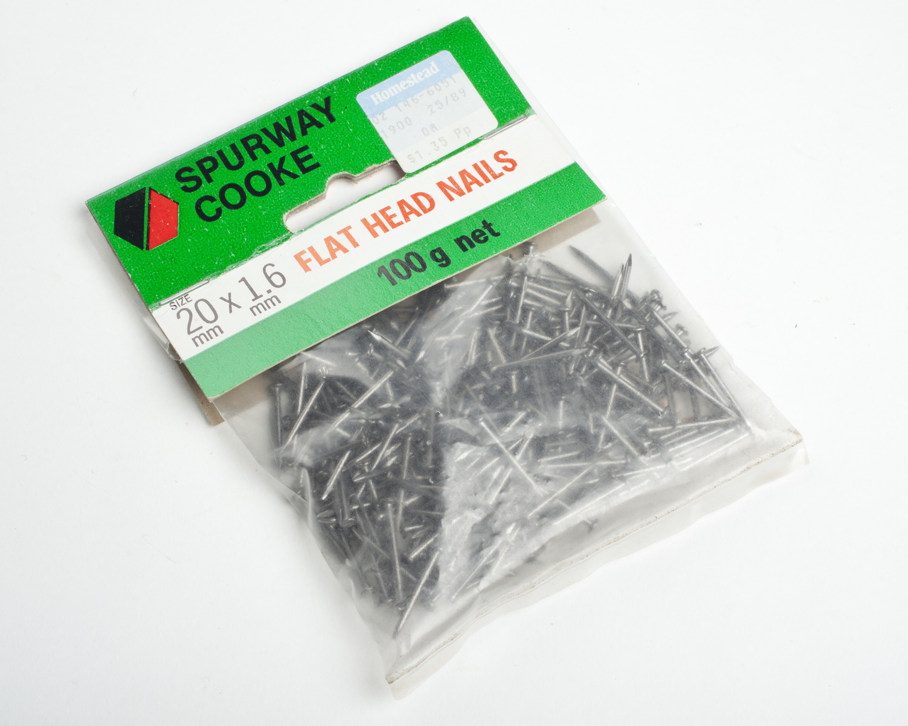 Bag of 20 x 1.2mm. 100gm of flat head nails made of grey metal. The plastic bag has a cardboard label folded over the open end and stapled closed. Has a tear in the plastic under the cardboard. Hole in card- board for hanging.