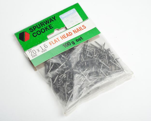 Bag of Flat Head Nails made by Spurway Cooke Industries Pty.Ltd, circa 1989. They were found in Area C at Adolph Bruhn & Son's Wood Turners Shop, 283 Coventry Street, South Melbourne. The business was established by Adolph Bruhn circa 1893 in Little Collins Street, Melbourne. Upon his death in 1919 it was then operated by Adolph's son Sophus Christopher Bruhn. Upon Sophus's death in 1959 his son Sophus Walter Bruhn took over the business. In 1970 Sophus reduced the scale of the business and relocated to South Melbourne. The business closed upon Sophus's death in January 1990.